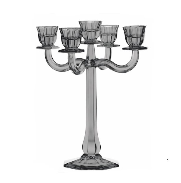 CHANDELIER CRISTAL MÉTALLISÉ 5 BRANCHES, Retour au vintage avec ce superbe chandelier en cristal smoke à 5 branches. L’élément parfait pour illuminer de 5 bougies votre table. Son pied octogonale lui assure un forte stabilité. De quoi éblouir vos convives avec cette pièce centrale.