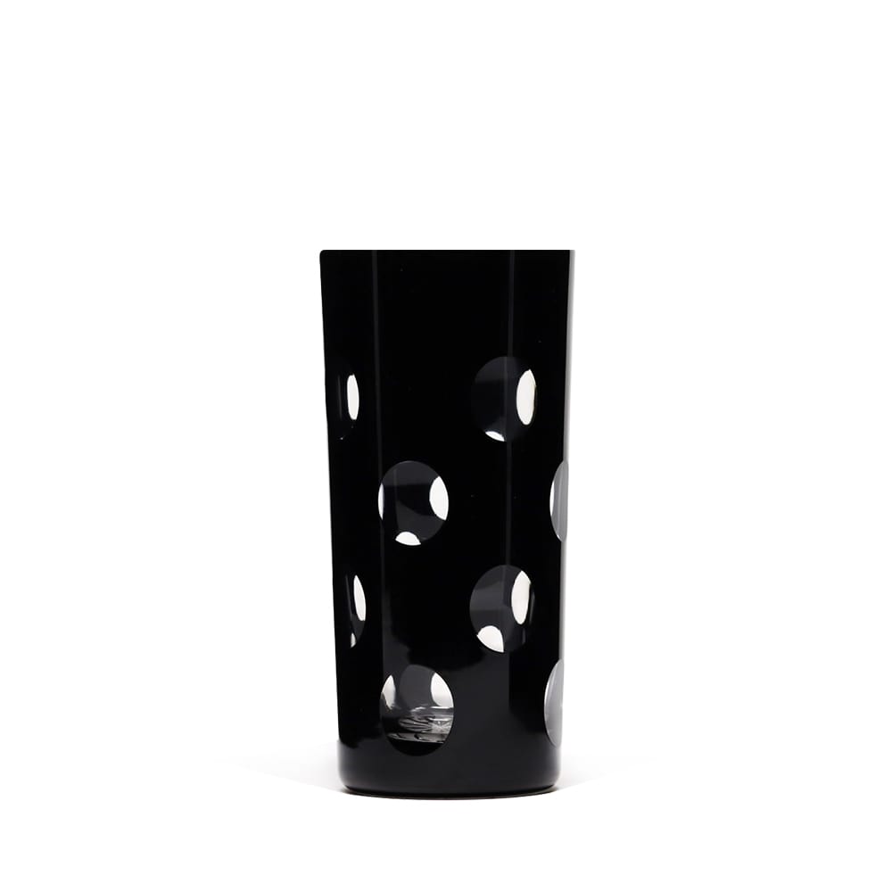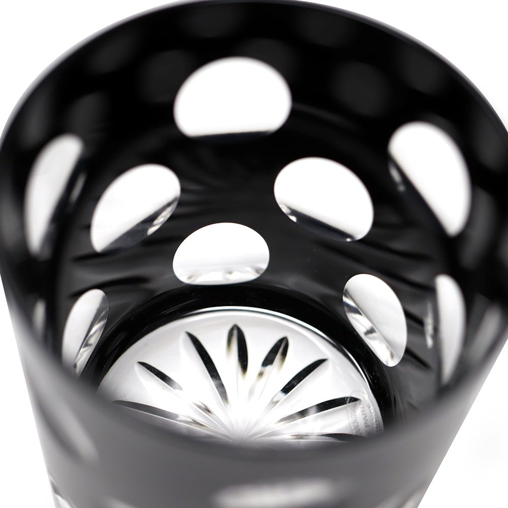 CHOPE CRISTAL NOIR PASTILLE, Le service Pastille créé par Cristal de Paris met à l’honneur le cristal noir. Ce motif de taille creuse circulaire crée un effet d’optique cinétique très typique du XXe siècle. On appréciera le travail de taille au niveau de la base.