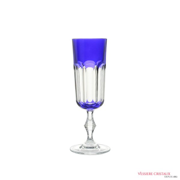 FLÛTE CHAMPAGNE CRISTAL BLEU NICOLE, Tout en élégance, la flûte à champagne Nicole reprend les codes du célèbre verre Harcourt. Cristal de Paris est un manufacture située en Lorraine, considérée comme une marque Premium, à la frontière des marques de Luxe. Fondée en 1970, l’entreprise familiale exporte en Russie, Chine, Inde, mais fournit également les grands palaces, comme l’hotel Bristol de Paris. Également disponible en coffret de 6 couleurs.