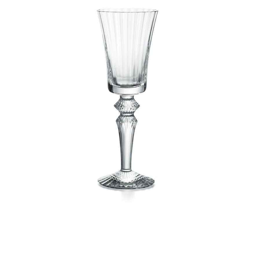 MILLE NUITS VERRE HAUT BACCARAT, Rayonnant depuis la jambe, le motif de côte vénitienne se poursuit sur le pied du verre. Élément décoratif emblématique de la collection de verres Mille Nuits, l’élégant bouton losangé au centre de la jambe fait le lien entre la base de la paraison et le pied. La collection Mille Nuits se décline aussi en Arts de la table (carafes et assiettes) et Décoration (chandeliers, lampes et candélabres). Grand verre Mille nuits Baccarat.