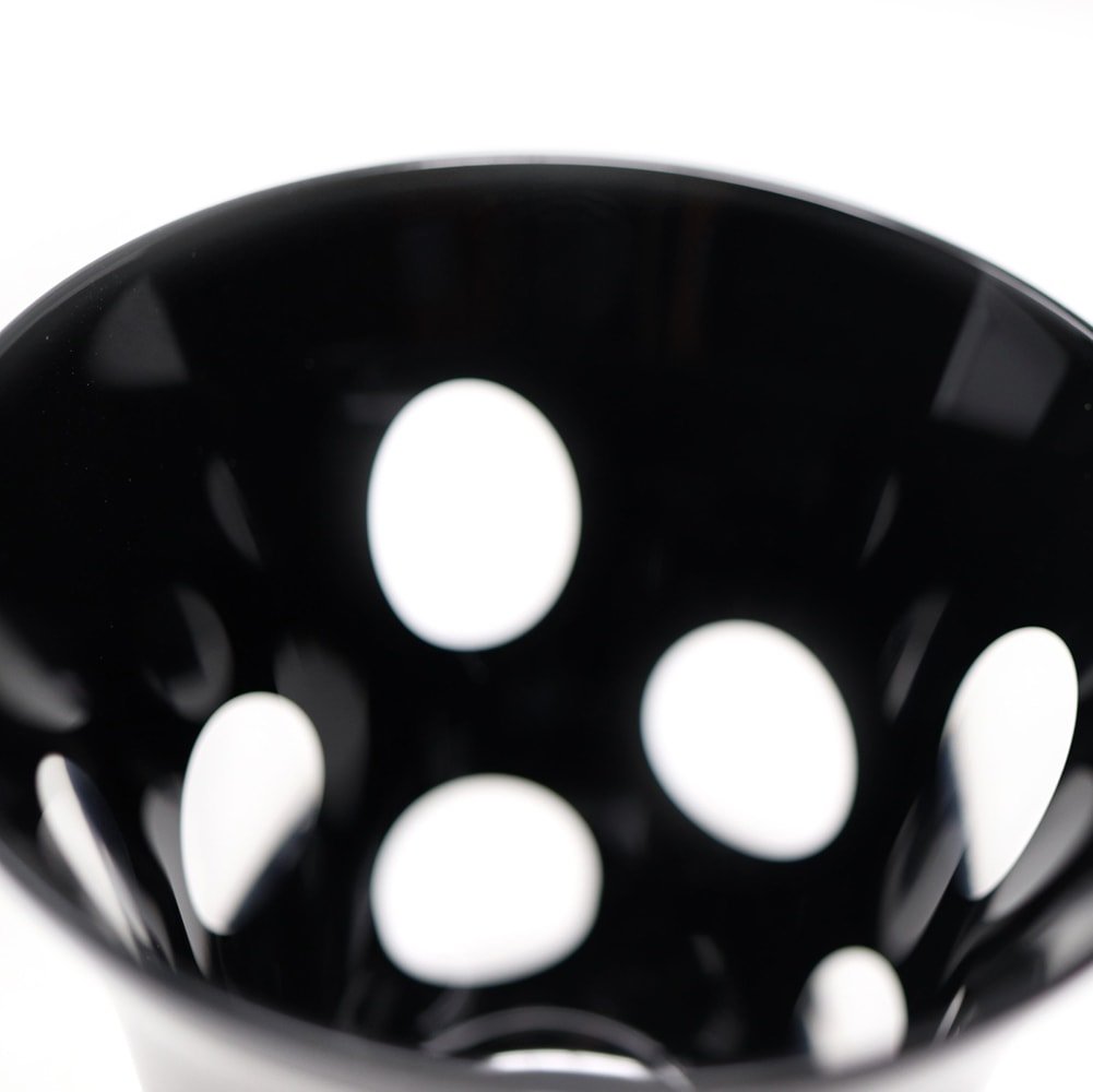 VERRE CRISTAL NOIR PASTILLE, Le service Pastille créé par Cristal de Paris met à l’honneur le cristal noir. Ce motif de taille creuse circulaire crée un effet d’optique cinétique très typique du XXe siècle. On appréciera le travail de taille au niveau du pied.