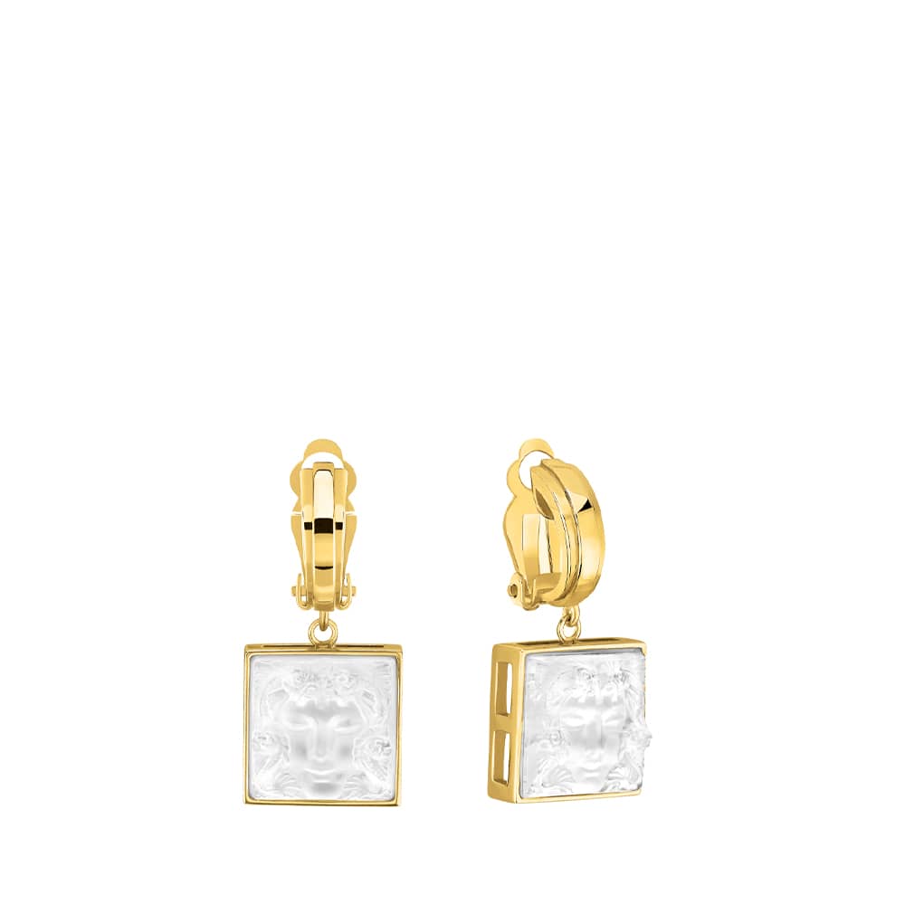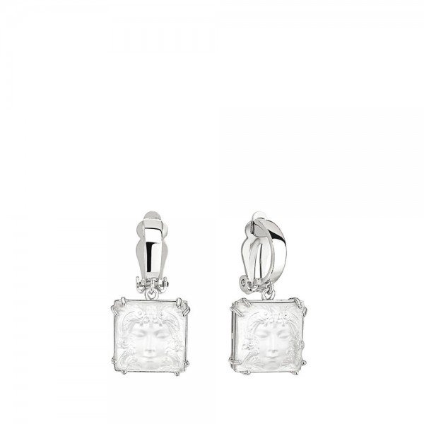 BOUCLES OREILLES MASQUE FEMME LALIQUE, La célèbre collection Aréthuse, motif « Masque de Femme », dévoile le visage d’une femme symbolisant la nymphe Aréthuse. Coiffée d’une faune aquatique. La visage Aréthuse est dessiné dans le cristal.