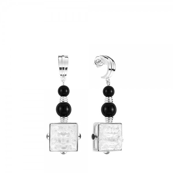 BOUCLES D’OREILLES ARGENT ARETHUSE, La célèbre collection Aréthuse, motif « Masque de Femme », dévoile le visage d’une femme symbolisant la nymphe Aréthuse, coiffée d’une faune aquatique. La visage Aréthuse est dessiné dans le cristal, sculpté de vagues et d’ondes évoquant le jaillissement de l’eau de la fontaine éponyme. La collection se décline dans le mobilier Lalique, ainsi que dans les coupes, photophores, boites Lalique. Boucles masque de femme argent Lalique.