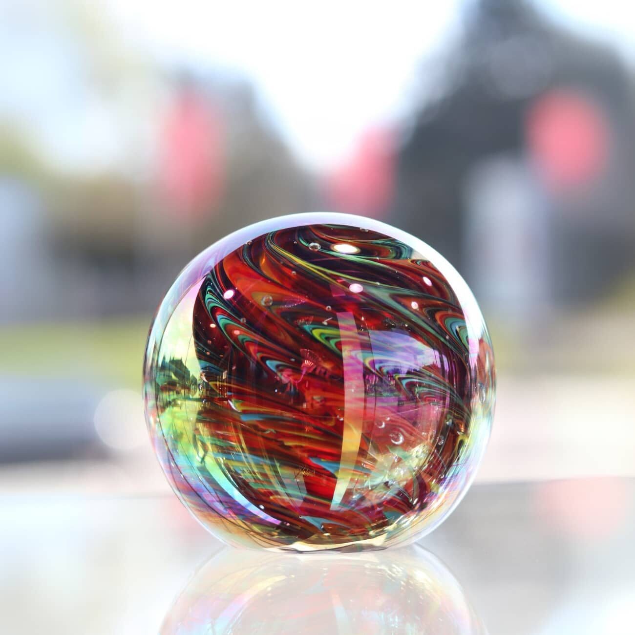 Spirale Stellaire capture l’infini dans une sphère, mêlant éclats pourpres, mordorés et émeraude en un tourbillon cosmique.