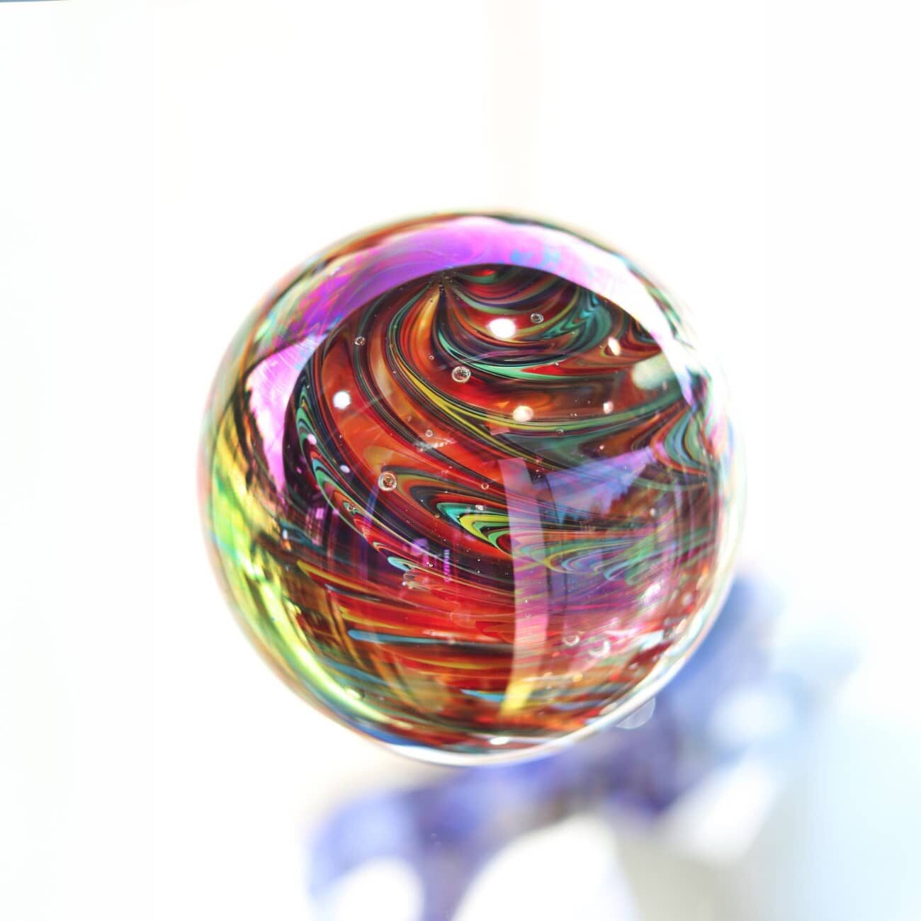 Soufflée bouche, cette œuvre évoque la danse des astres au cœur des galaxies lointaines. Une invitation à contempler l’univers… au creux de la main.