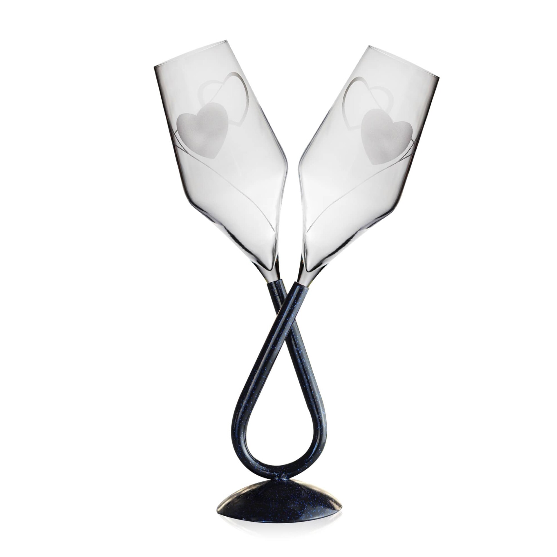 Avec son pied unique, chaque flûte se détache du support pour ensuite revenir prendre place. Un duo symbolisant l’amour uni de deux personnes, partageant le même moment.