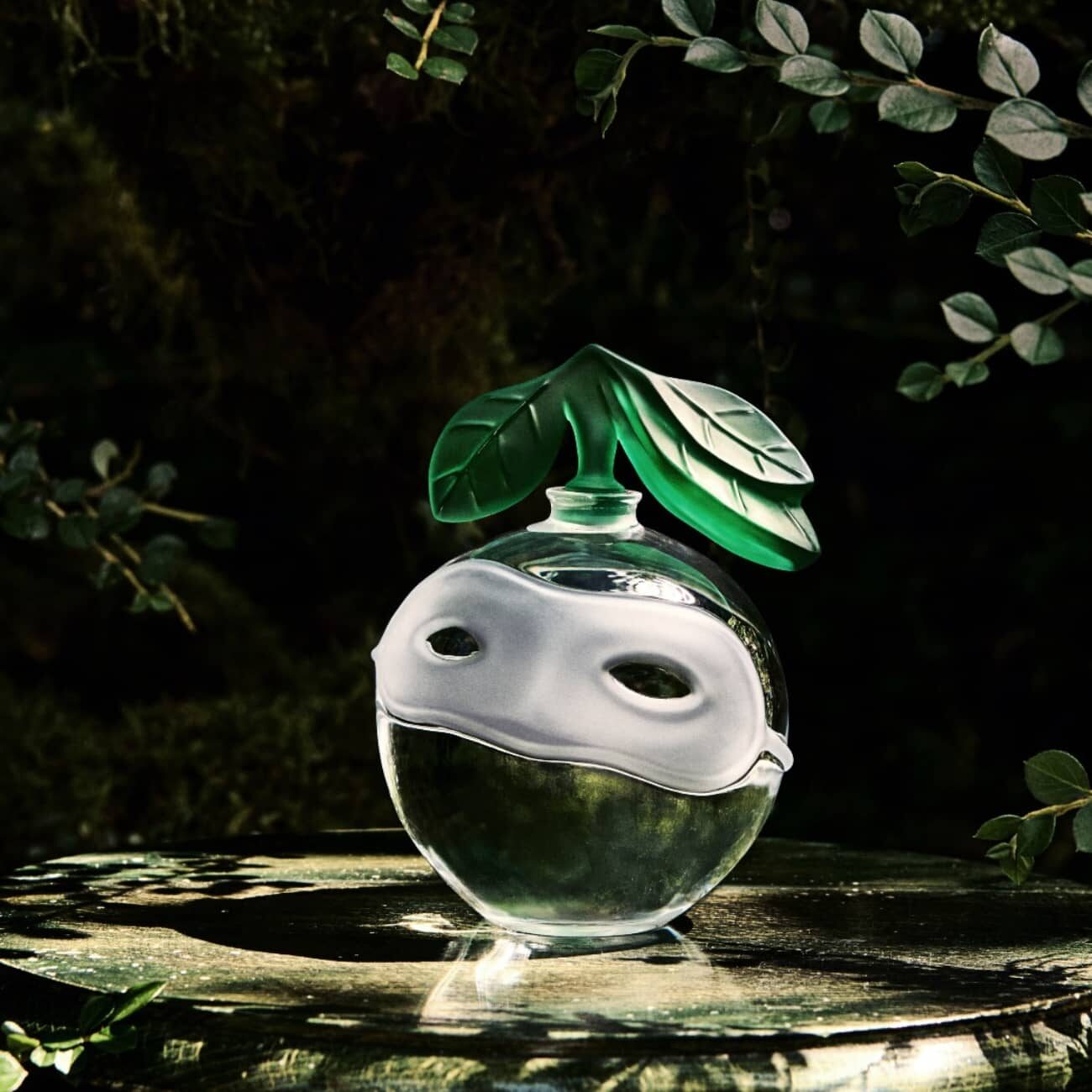 Consciente de l’importance iconique de ces objets, la Maison Lalique les a transposés dans du cristal. Représentant une pomme parfaite singulièrement masquée, le flacon La Valse Hésitation est composé d’un subtil contraste entre parties translucides et surfaces satinées. Les lignes douces et les formes texturées convoquent naturellement les sens, tandis que l’élégante simplicité de la pomme est rehaussée par les détails en verre dépoli du masque.
