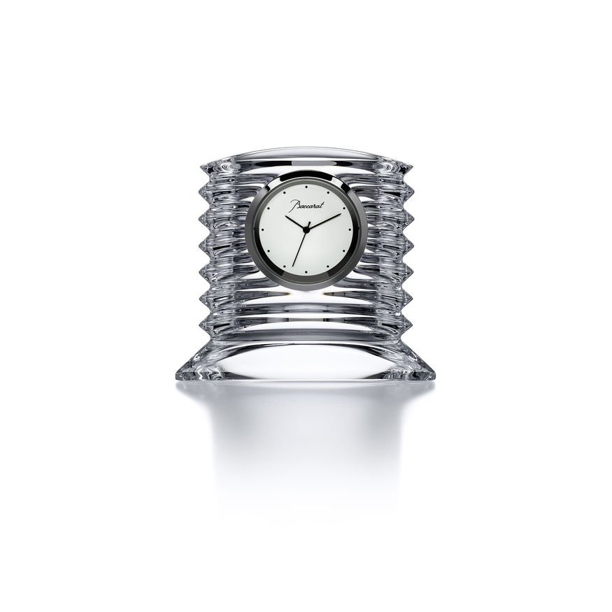 LALANDE PENDULETTE BACCARAT, La forme ondoyante de la pendulette Lalande crée un magnifique effet optique lorsqu’elle interagit avec la lumière. La face de la pendulette circulaire blanche est minimaliste, avec le nom Baccarat écrit discrètement en cursive élégante. Le dessin classique de la pendulette est aussi intemporel qu’opportun. Cet accessoire de bureau a été dessiné pour Baccarat par Savinel & Rozé, auteurs de nombreux accessoires pour la maison et pour la table pour la marque. L’étonnant porte-crayons Lalande partage avec la pendulette la même luminosité splendide et la la même silhouette biseautée séduisante.