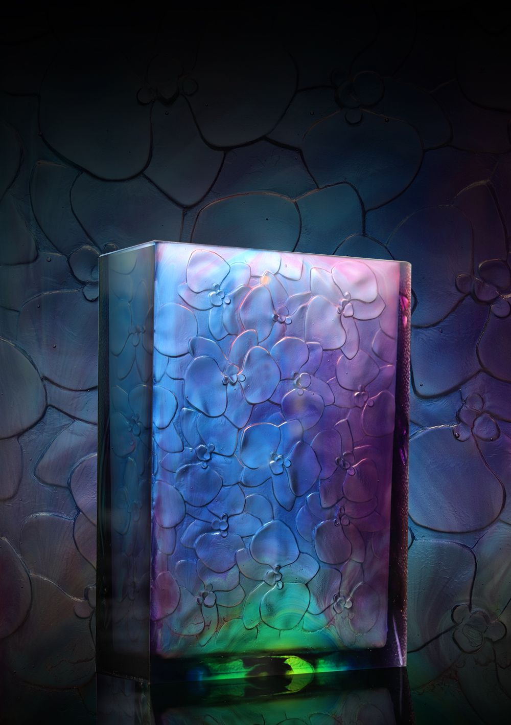 Spécificité chez Daum, copiée mais jamais égalée, la Pâte de Cristal, matériau précieux qui donne à l’objet une dimension sculpturale, n’a cessé de se développer. En conséquence, La Pâte de Cristal a cette particularité d’ajouter aux formes qu’elle reproduit la translucidité. La brillance de cette matière, les intensités de couleur et ses tonalités ombrées lui confèrent toute sa singularité.