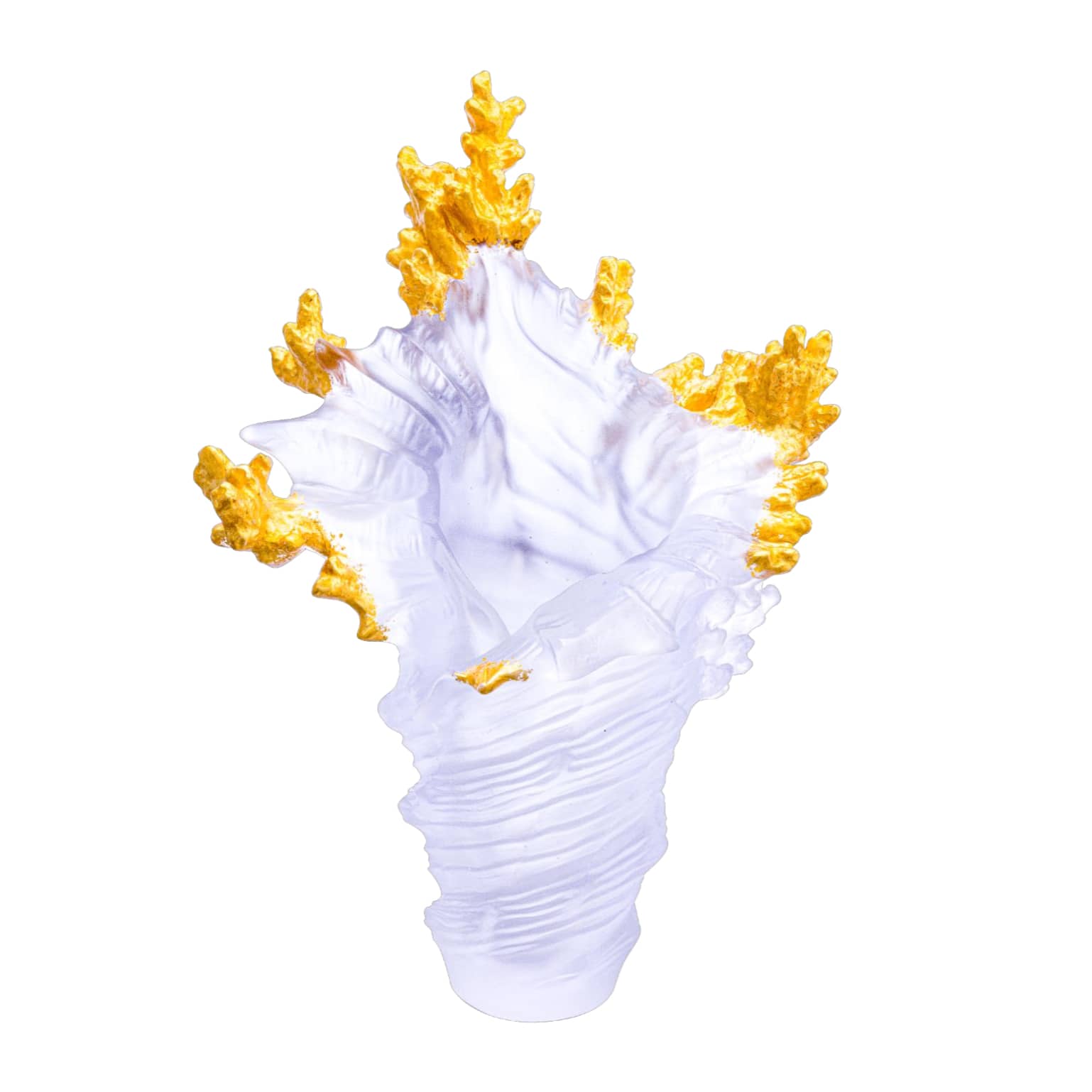 La collection Mer de Corail est l’inspiration d’un voyage sans frontières. La Maison Daum continue d’explorer ce territoire extraordinaire et présente ce sublime vase imaginé comme un corail blanc, décoré a la feuille d’or, appliqué a la main selon une technique ancestrale. Tels des rayons dorés se reflétant a la surface de la mer, la fine dorure souligne la préciosité et la fragilité du corail, et le cristal blanc translucide crée de subtiles nuances.