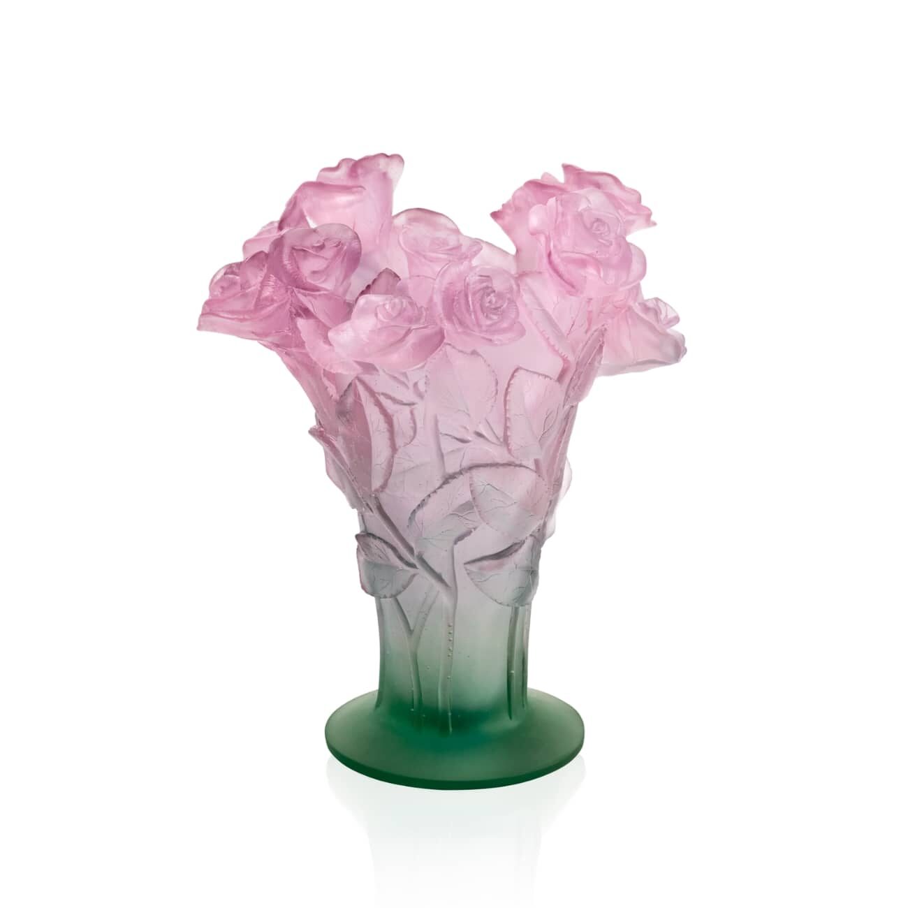 VASE ROSES DAUM, Le vase rose est ici une superbe réalisation en pâte de cristal. Grand classique de la Maison, le vase pousse les détails jusqu’à la perfection.