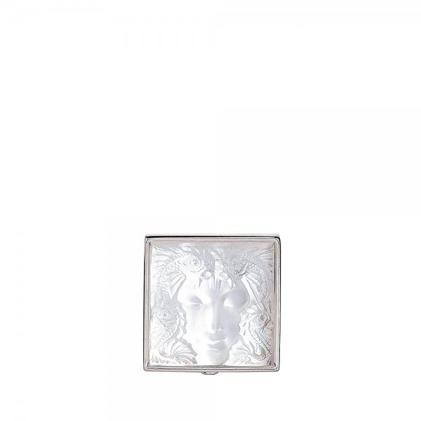 BROCHE ARETHUSE LALIQUE, Les yeux mi-clos, les lèvres sensuelles, ce visage féminin hiératique et juvénile est gracieusement coiffé d’une parure aquatique. Les poissons finement ciselés dansent et effleurent ses joues avec leurs écailles rugueuses et bosselées. Initialement destiné à une fontaine, ce masque incarne à la fois l’eau et la féminité qui fascine René Lalique. L’artiste transforme la beauté virginale en motif décoratif dans l’esprit Art déco et oppose avec art la transparence de l’eau à la sensualité du verre satiné. Découvrir la collection Aréthuse.
