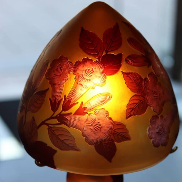 Découvrez cette lampe en verre multicouche, gravée à l’acide, décor Art nouveau.