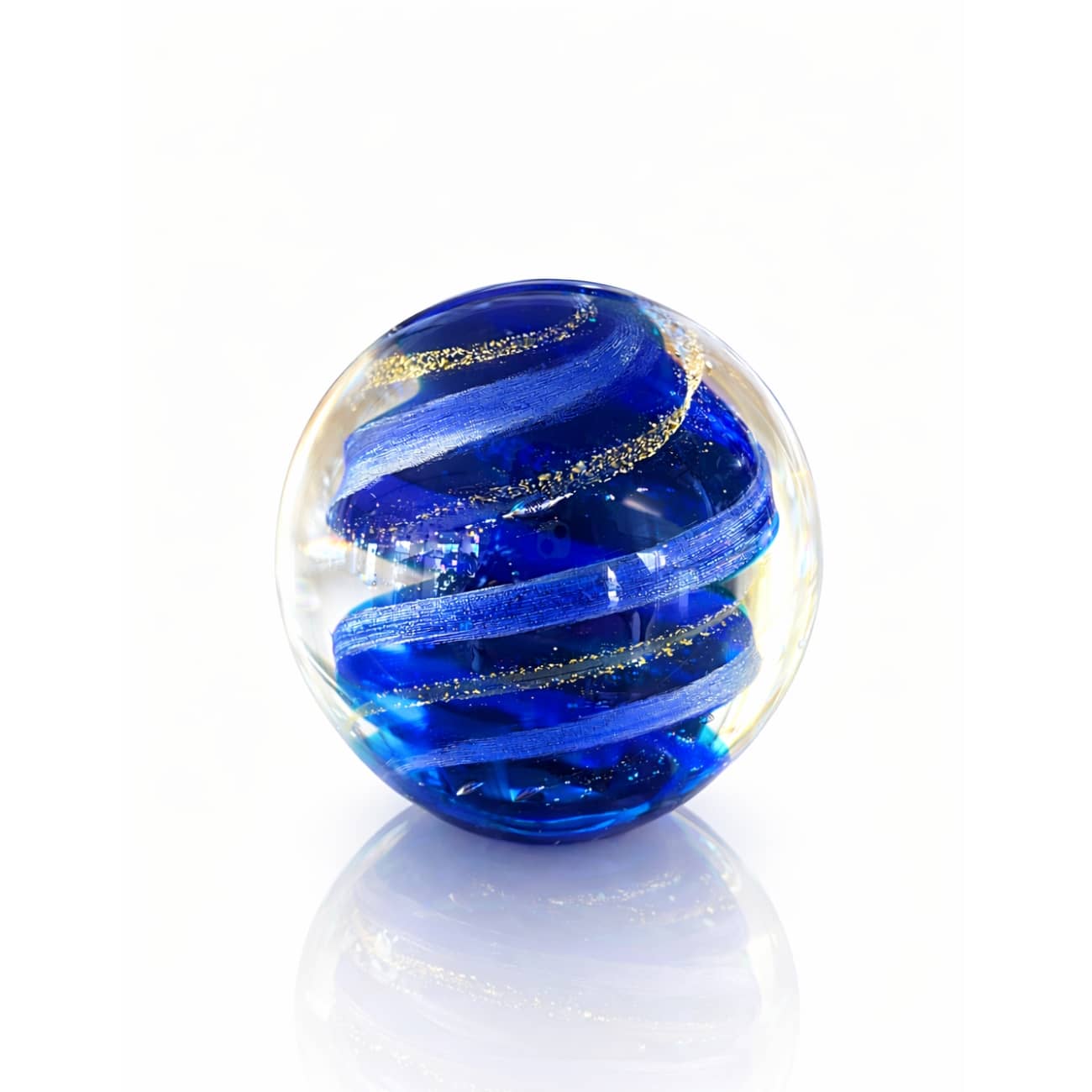 Au cœur de cette sphère se dévoile un scintillement envoûtant de vagues bleues aux reflets dorés.