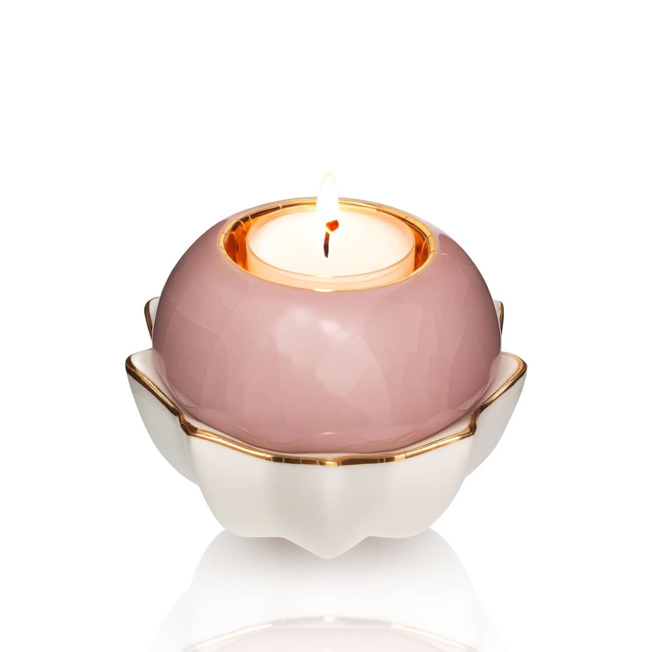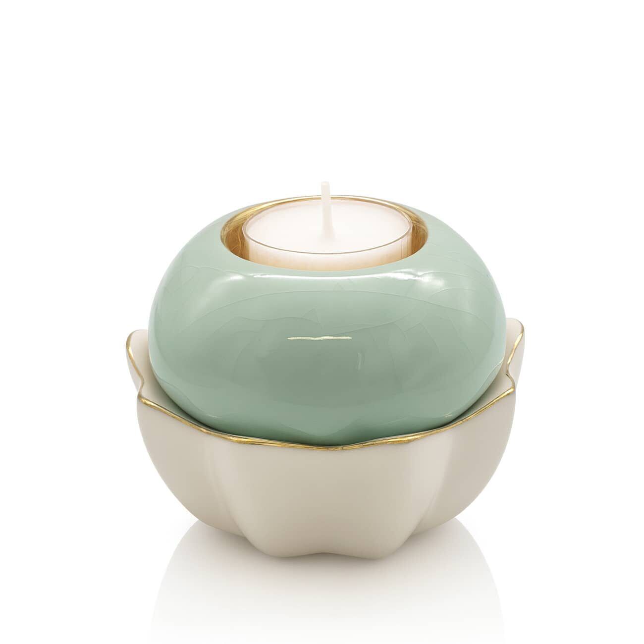 Évoquant la pureté du lotus, ce bougeoir délicat se compose d’un socle immaculé aux contours soulignés d’or, surmonté d’une coupole aux teintes douces, ivoire, vert d’eau ou rose. Chaque intérieur est sublimé d’un éclat d’or 24 carats, symbole de lumière et de renouveau. Élégance et spiritualité s’entrelacent dans cette création raffinée.