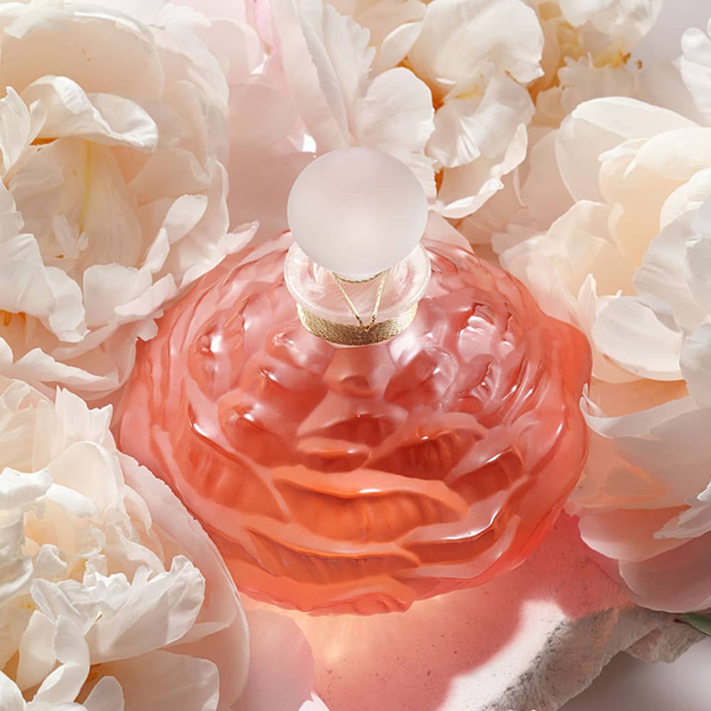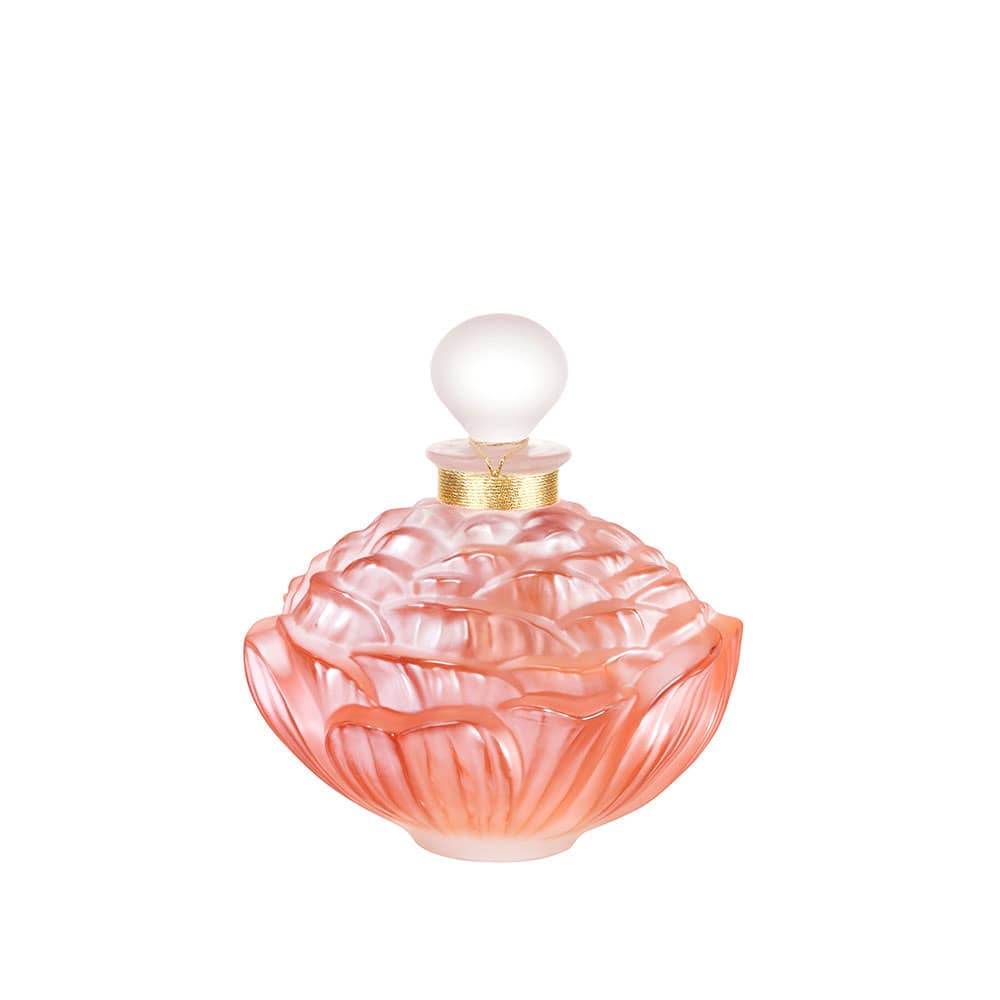 Véritable prouesse de la cristallerie, « Pivoine » magnifie à la fois la force et la grâce de la fleur. La corolle éclose de la pivoine forme le corps arrondi du flacon. Ses pétales doucement incurvés semblent sculptés à même le cristal satiné, comme si un sculpteur les avait tirés d’un roc. L’ourlé et les fines nervures de chaque pétale, réalisés en cristal transparent, soulignent le raffinement du motif floral et révèlent la nuance du parfum Lalique de Lalique, un rose pivoine tendre. Délicate goutte de rosée posée sur le cœur de la fleur, le bouchon arrondi en cristal satiné couronne le col du flacon.