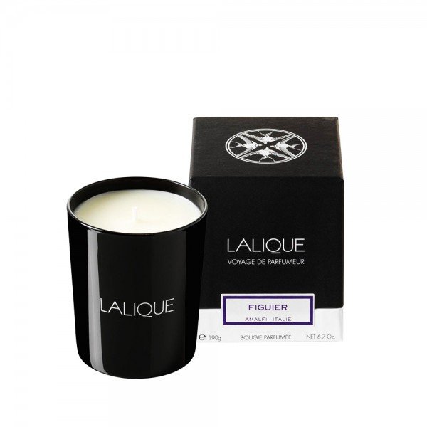 BOUGIE PARFUMEE FIGUIER LALIQUE, Sur la côte amalfitaine, des falaises arides, le bleu de la mer et un arbre : le figuier, couvert de fruits à la chair tendre et goûteuse. L’odeur douce, un peu lactée et verte de la figue s’entremêle à celle des feuilles de l’arbre et de la végétation alentour. En tête, des fleurs d’agrumes se posent sur un coeur de figue fraîche et de fleur de ciste qui se fondent en des notes de figue sèche et de laurier. On dirait le Sud…