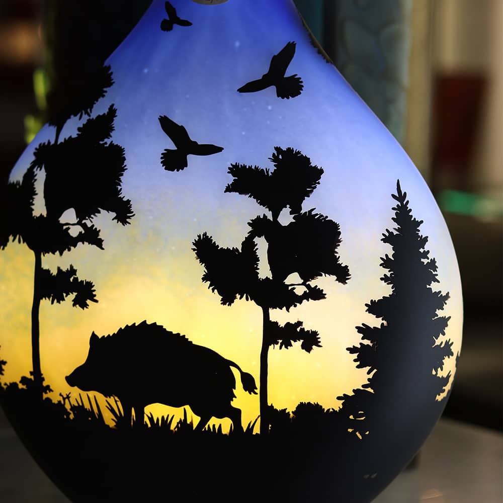 Découvrez cette lampe unique en cristal à décor de cerf et de sanglier sur l’autre face, fabriquée en Lorraine.