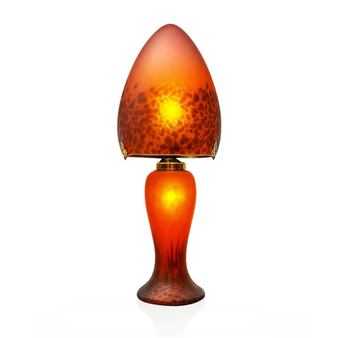 Tel un souffle de lumière capturé dans l’écrin de la nature, cette lampe champignon en verre rend hommage au génie Art nouveau à Nancy. Évoquant les premiers éclats de l’électricité au cœur de la Belle Époque, elle mêle l’éclat ambré du feu à la poésie végétale de l’Art nouveau.