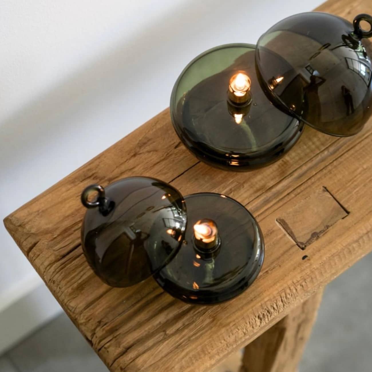 | Une boule en verre soufflé, un design unique pour une lampe à l’huile.