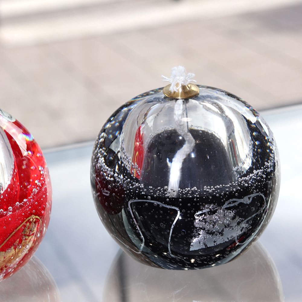 LAMPE HUILE CRISTAL NOIR ARGENT, Création unique et artisanale, cette lampe à l’huile est soufflée bouche et peinte à la main. Installé depuis plus de 25 ans entre St Louis-Arzviller et le fameux rocher de Dabo en Lorraine, les artisans verriers de la région vous offre une production de haute qualité.