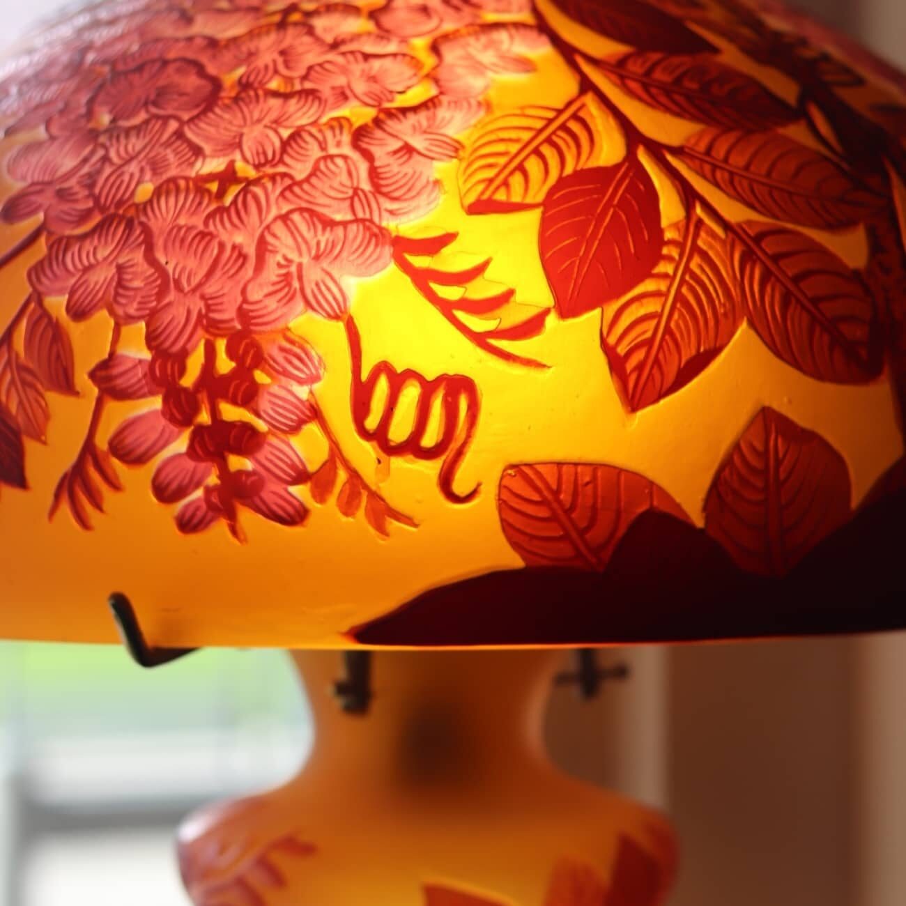 Découvrez cette lampe en verre multicouche, gravée à l’acide, décor Art nouveau.