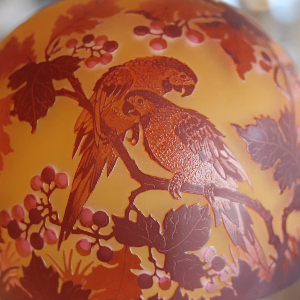 Technique du verre gravé à l’acide. Le verre multicouche, travail à chaud, est une superposition par cueillage successif de couches de verre de couleurs différentes. Généralement, les décors des pièces exigent des doublés ou des triplés, plus rarement quatre ou cinq couches de verre.