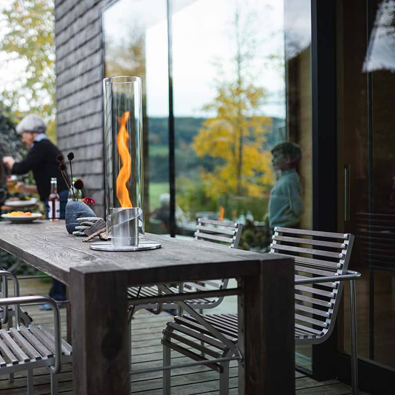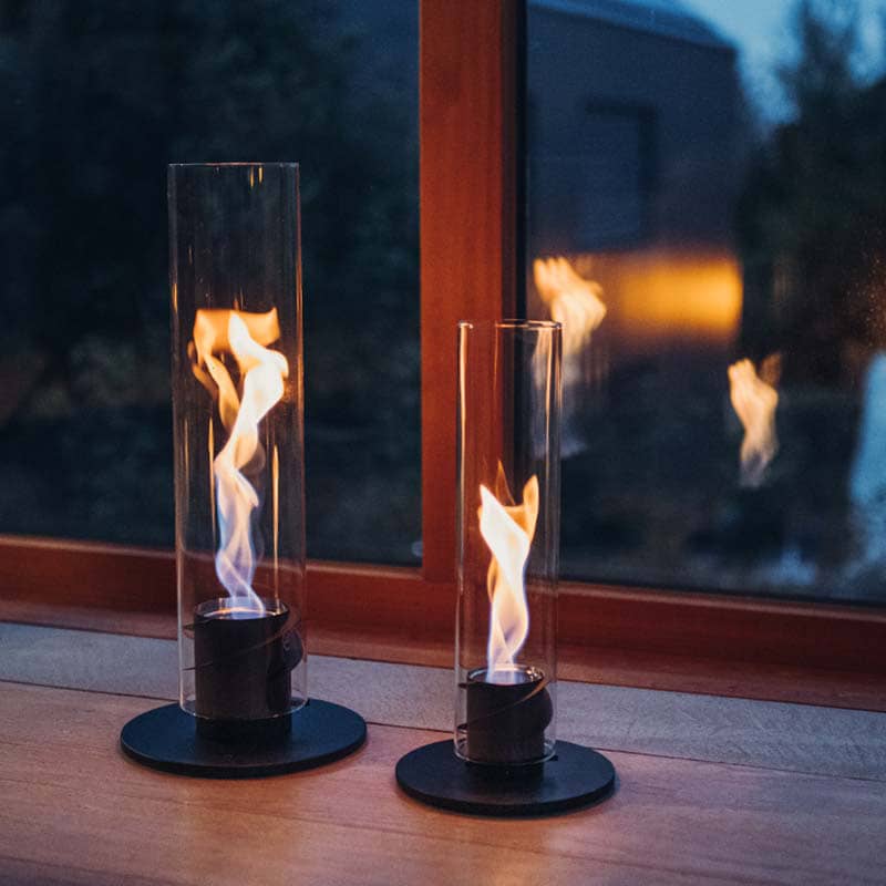 Ce jeu de flamme impressionnant est basé sur le bioéthanol qui est brûlé dans une cartouche. Il suffit de placer la cartouche dans le pied en acier inoxydable et de l’allumer.
