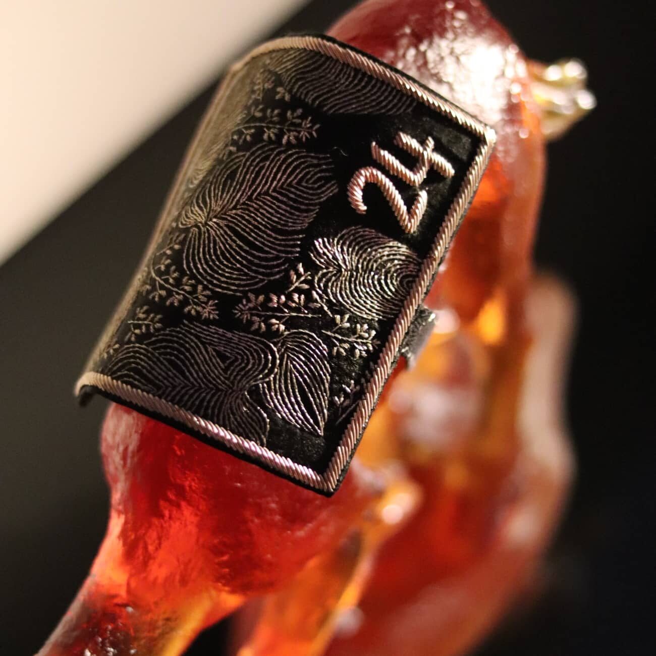 La transparence du cristal souligne la souplesse de cet animal à une bosse avec cette harmonie chaleureuse d’ambre orangé.