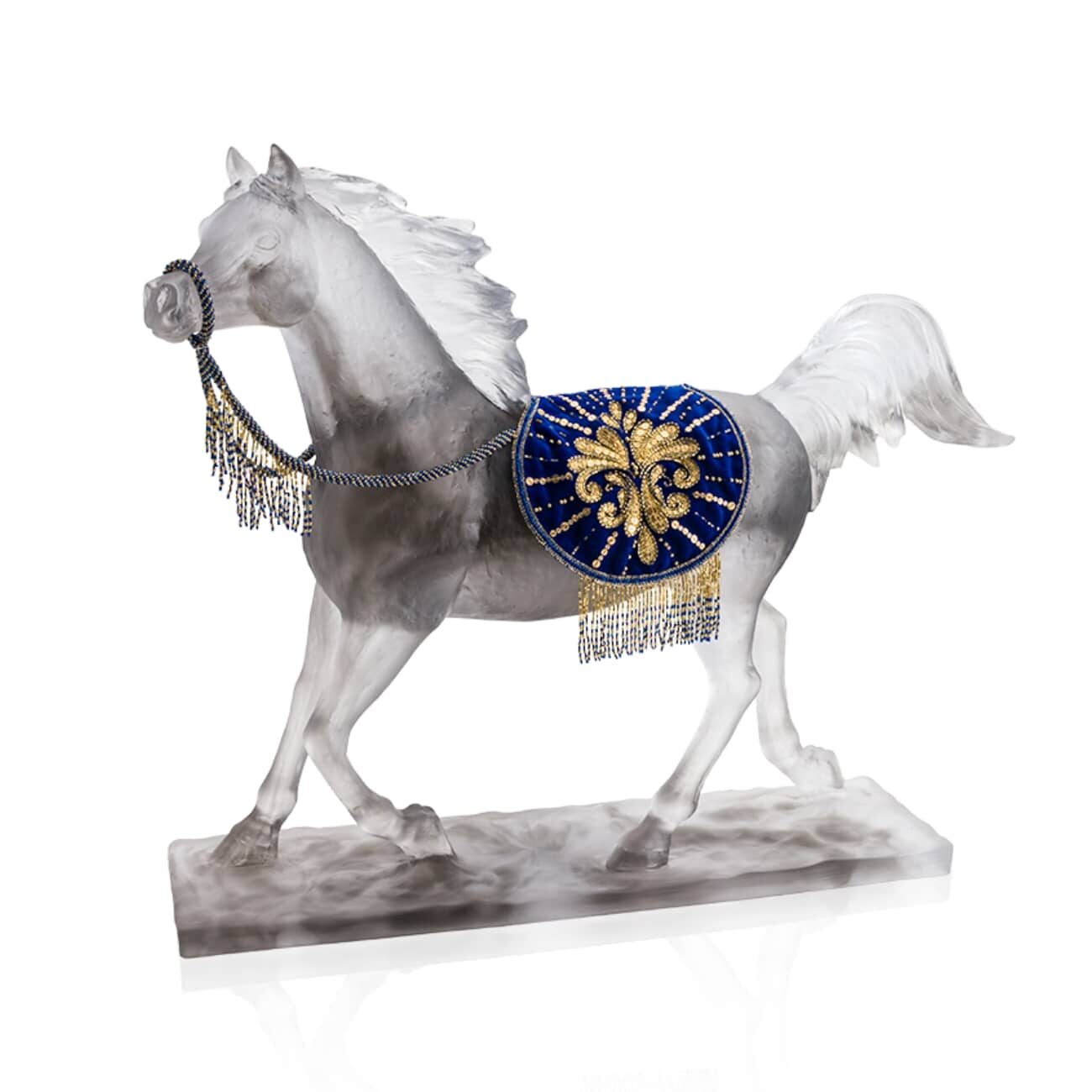 Dans cette nouvelle édition du Cheval Majestueux, les ateliers Daum réinterprètent la noblesse du pur-sang arabe, capturant son port altier, sa tête expressive et sa silhouette fluide dans un somptueux cristal blanc-gris.