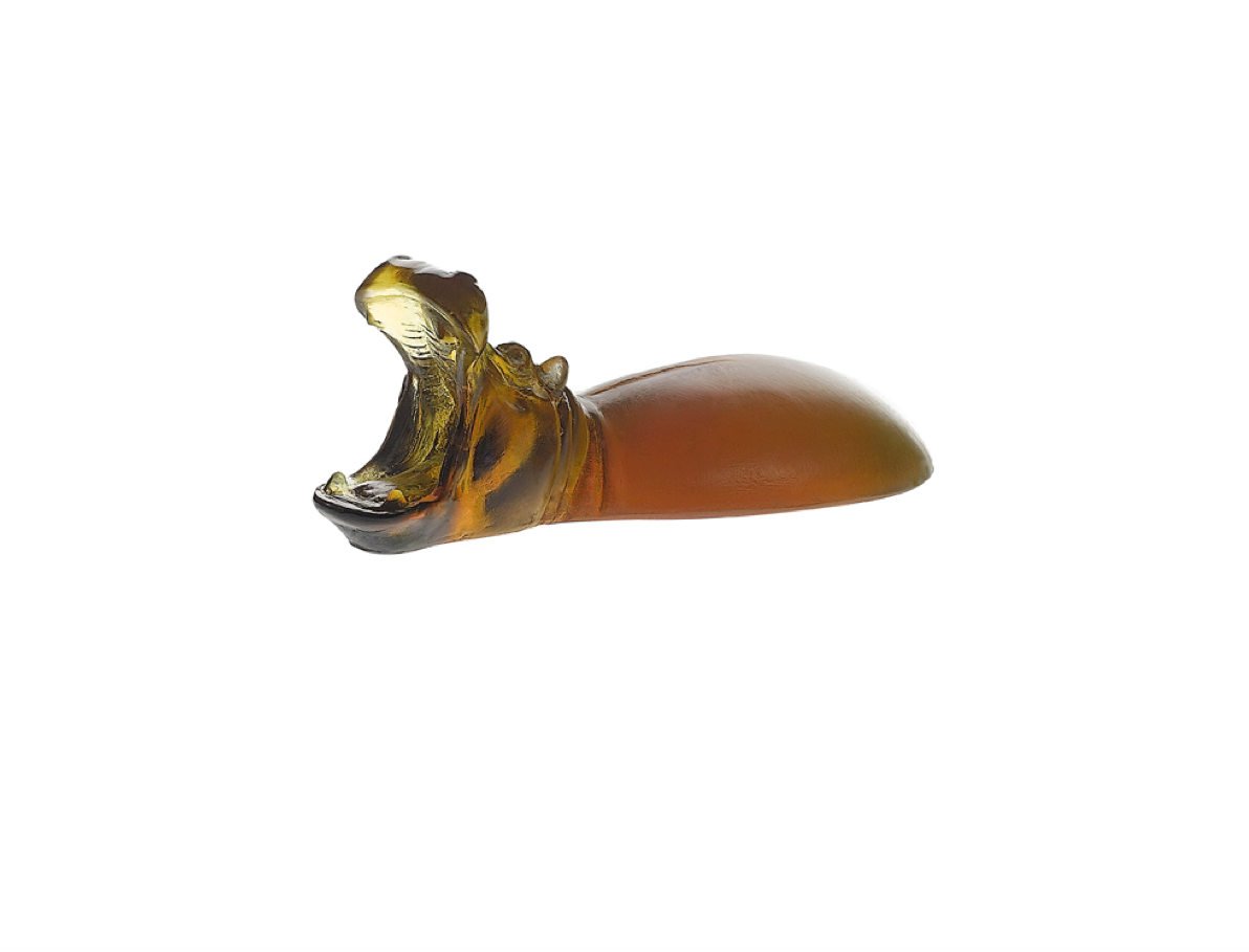 PRESSE-PAPIER HIPPOPOTAME DAUM, Hippopotame en pâte de cristal, de la collection Daum. L’hippopotame ambre imerge de l’eau, pour en faire un presse-papier. Sculpture hippopotame pâte de cristal Daum, Figurine hippopotame en cristal.