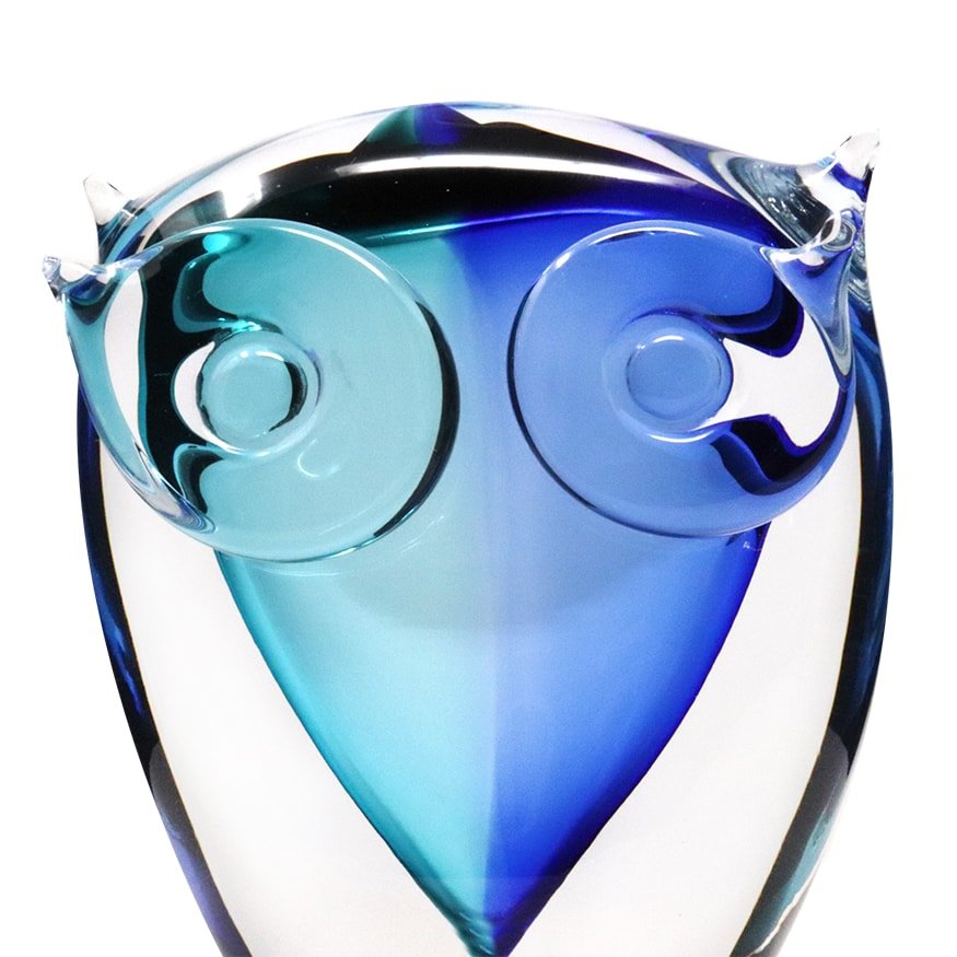 Découvrez la sculpture chouette cristal bleu. Entièrement réalisée à la main, cette chouette en cristal ravira les collectionneurs ! Le maître verrier exécute d’abord la forme de la chouette à l’aide de sa mailloche, puis cueille dans le four en fusion la matière nécessaire afin de réaliser les deux grands yeux.