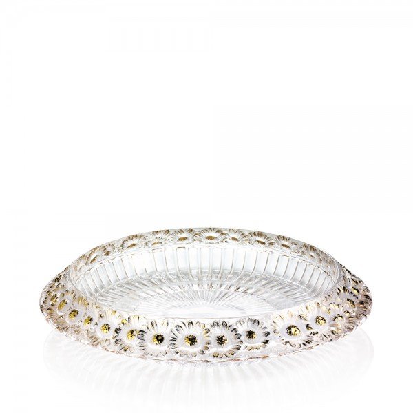 COUPE MARGUERITES OR LALIQUE, Créé par René Lalique en 1941, la coupe marguerites est symbole de pureté, d’innocence et d’amour loyal. Une coupe plate demandant un véritable travail à froid, lors de l’application à la main de la couleur or sur les marguerites.