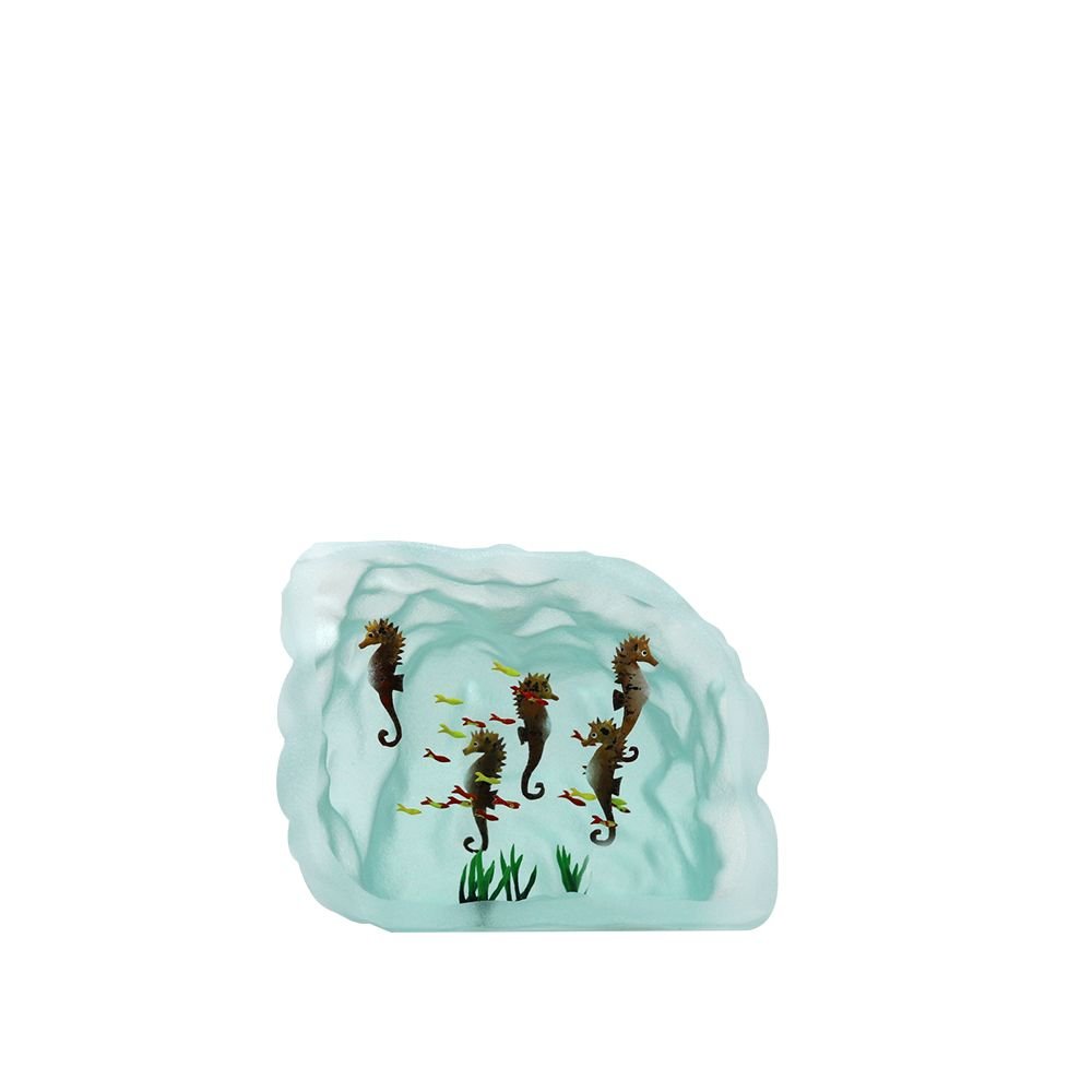 Yves Trucchi travaille le verre à froid par collage et usinage au jet de sable. Il assemble les différents volumes jusqu’à obtenir l’effet de profondeur voulu. Il cherche une harmonie dans la disposition des bancs de poissons en s’inspirant des ambiances sous-marines. Il fait évoluer ces minuscules habitants des mers en les gravant dans la matière. Puis les peint. L’impression de les voir nager, suspendus dans l’élément liquide, est totale.