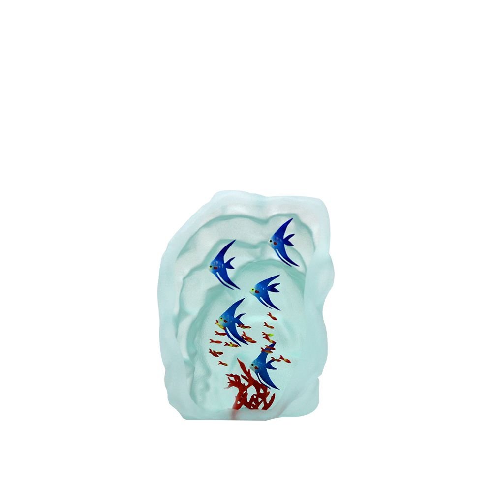 Yves Trucchi travaille le verre à froid par collage et usinage au jet de sable. Il assemble les différents volumes jusqu’à obtenir l’effet de profondeur voulu. Il cherche une harmonie dans la disposition des bancs de poissons en s’inspirant des ambiances sous-marines. Il fait évoluer ces minuscules habitants des mers en les gravant dans la matière. Puis les peint. L’impression de les voir nager, suspendus dans l’élément liquide, est totale.