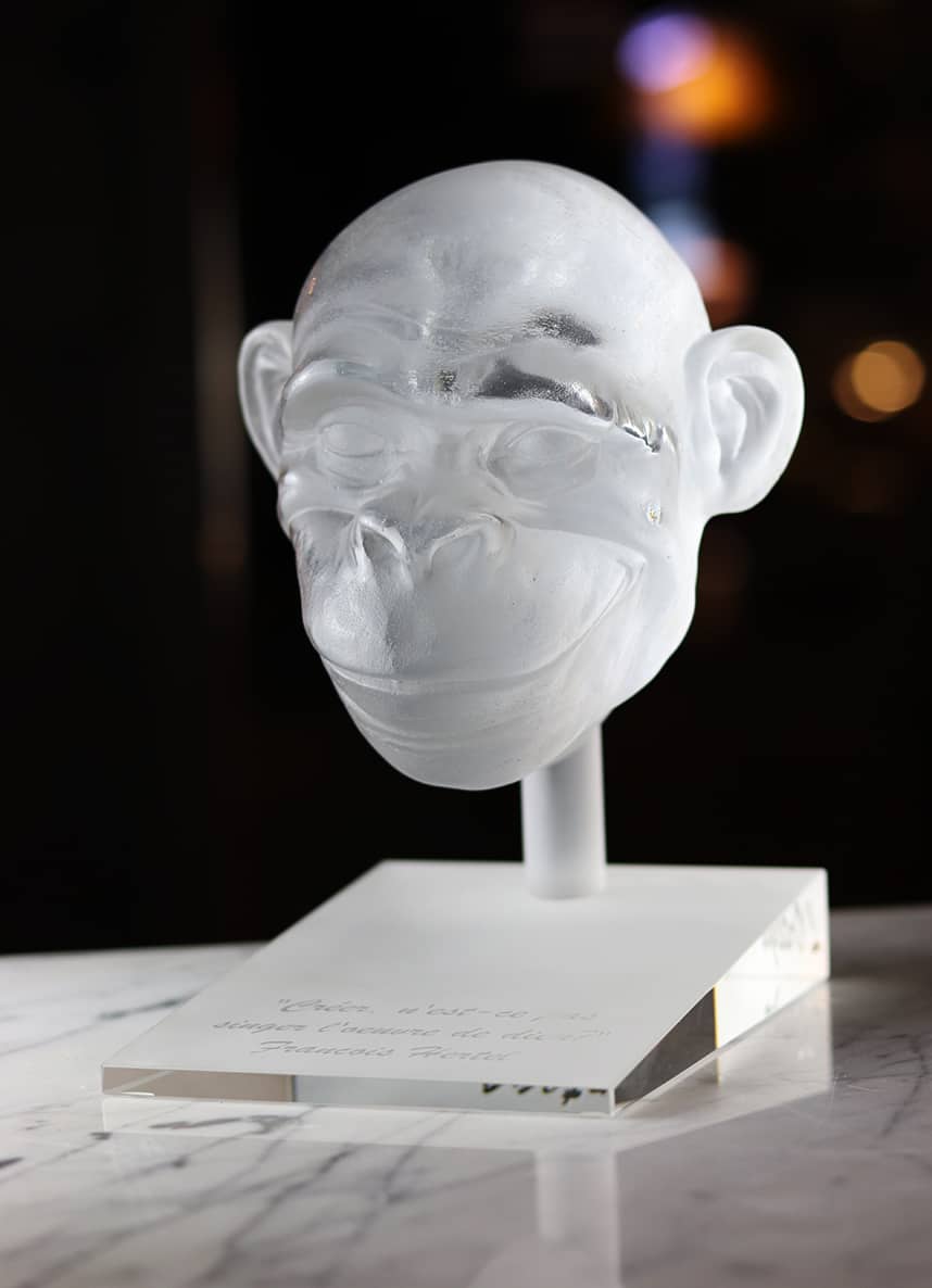 Découvrez cette tête de chimpanzé réalisée en pâte de cristal par un artisan d’art lorrain, Loïc Ortega, installé dans la cité du cristal.
