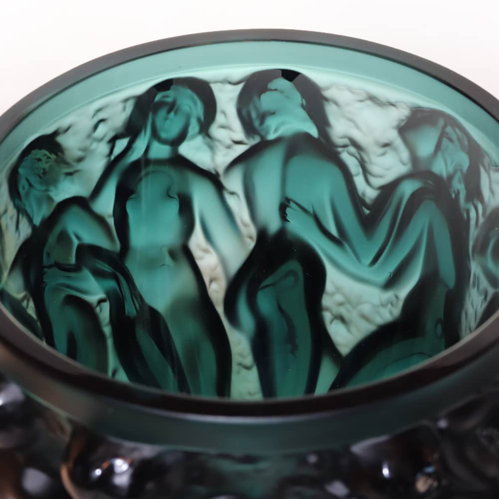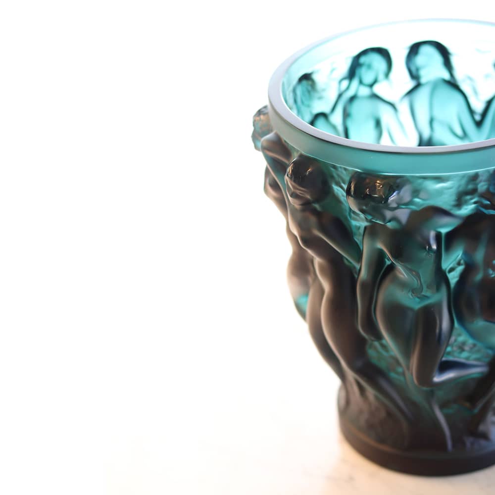 VASE BACCHANTES VERT LALIQUE, En 1927, l’imagination et le génie créatif de René Lalique ont donné naissance au vase Bacchantes. Véritable ode à la féminité, cette ronde de nus sculpturaux en bas relief est emblématique du style Lalique. D’une splendeur insolente et d’une sensualité troublante, les jeunes prêtresses de Bacchus offrent leur beauté et leurs courbes voluptueuses. Le cristal satiné rappelle la finesse du grain de peau tandis que les jeux de lumière insufflent vie et mouvement à la pièce. Vase Bacchantes Lalique nouveauté 2017. Vase Bacchantes cristal vert Lalique.