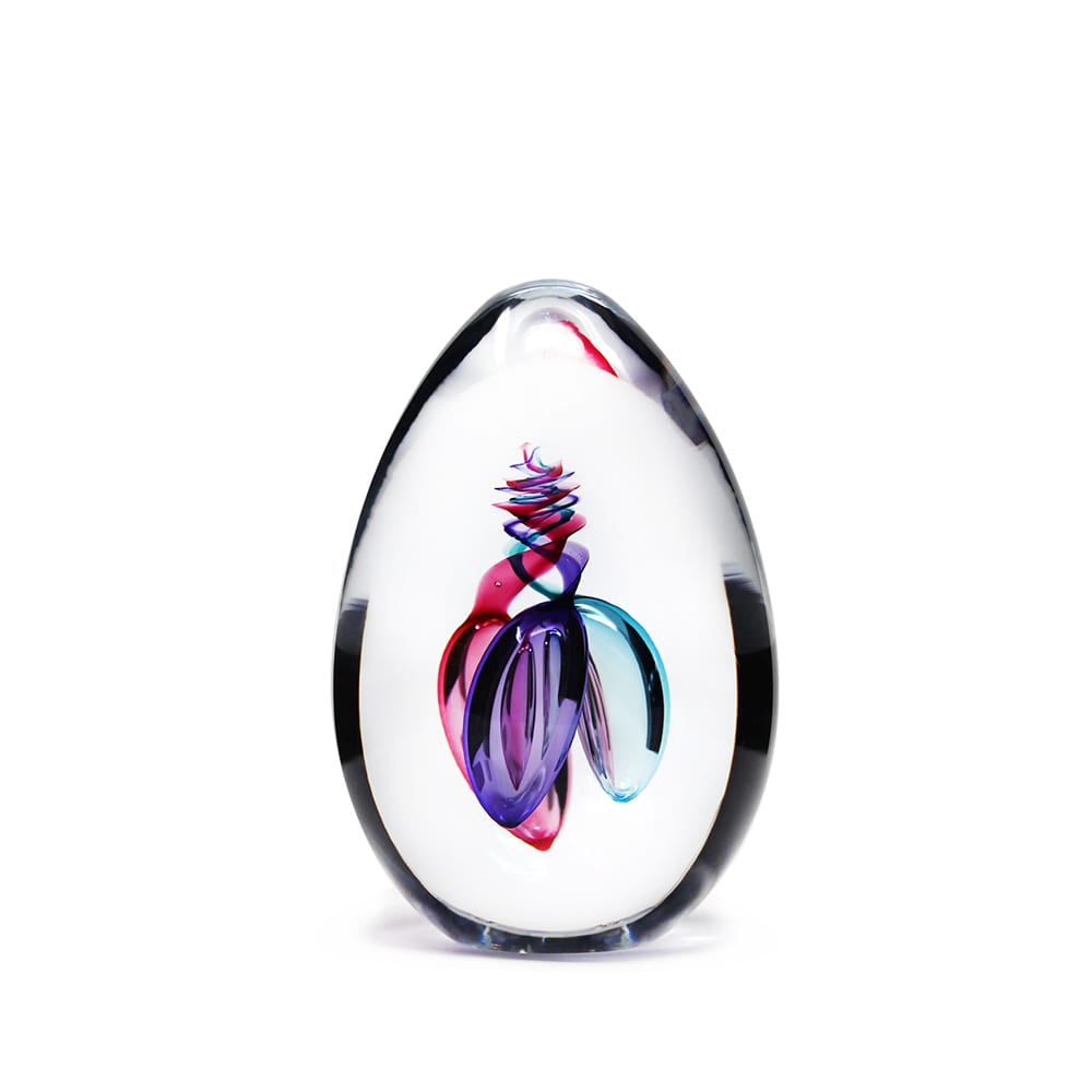 Prouesse de maîtrise, l’artisan verrier réalise ici une triple inclusion de couleur dans la masse de cristal. Tel un tourbillon, ces trois « poumons » de couleur laisse libre choix d’interprétation.