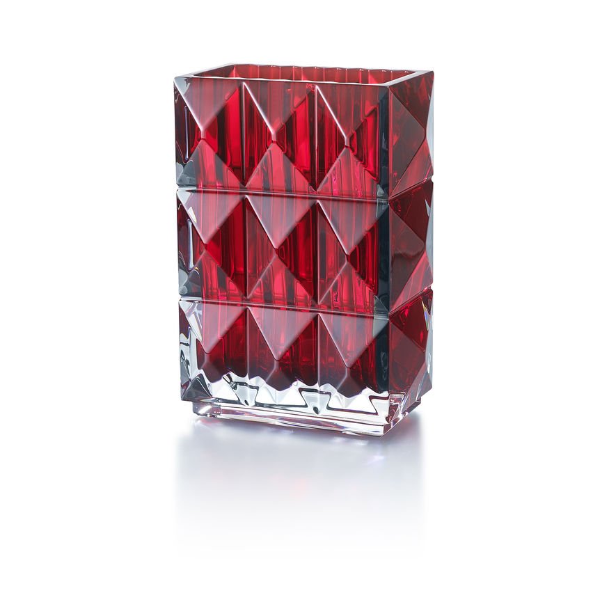 LOUXOR ROUGE VASE DIAMANT BACCARAT, Nouveauté 2016, le vase Louxor est paré d’un rouge vif. La collection créée en 2010 par Thomas Bastide se développe progressivement. Le vase se pare de 9 pyramides sur les faces principales et 3 sur les cotés, un style très typique à Baccarat. Vase Baccarat Thomas Bastide, Vase diamant cristal rouge baccarat, Vase Louxor rouge Baccarat.