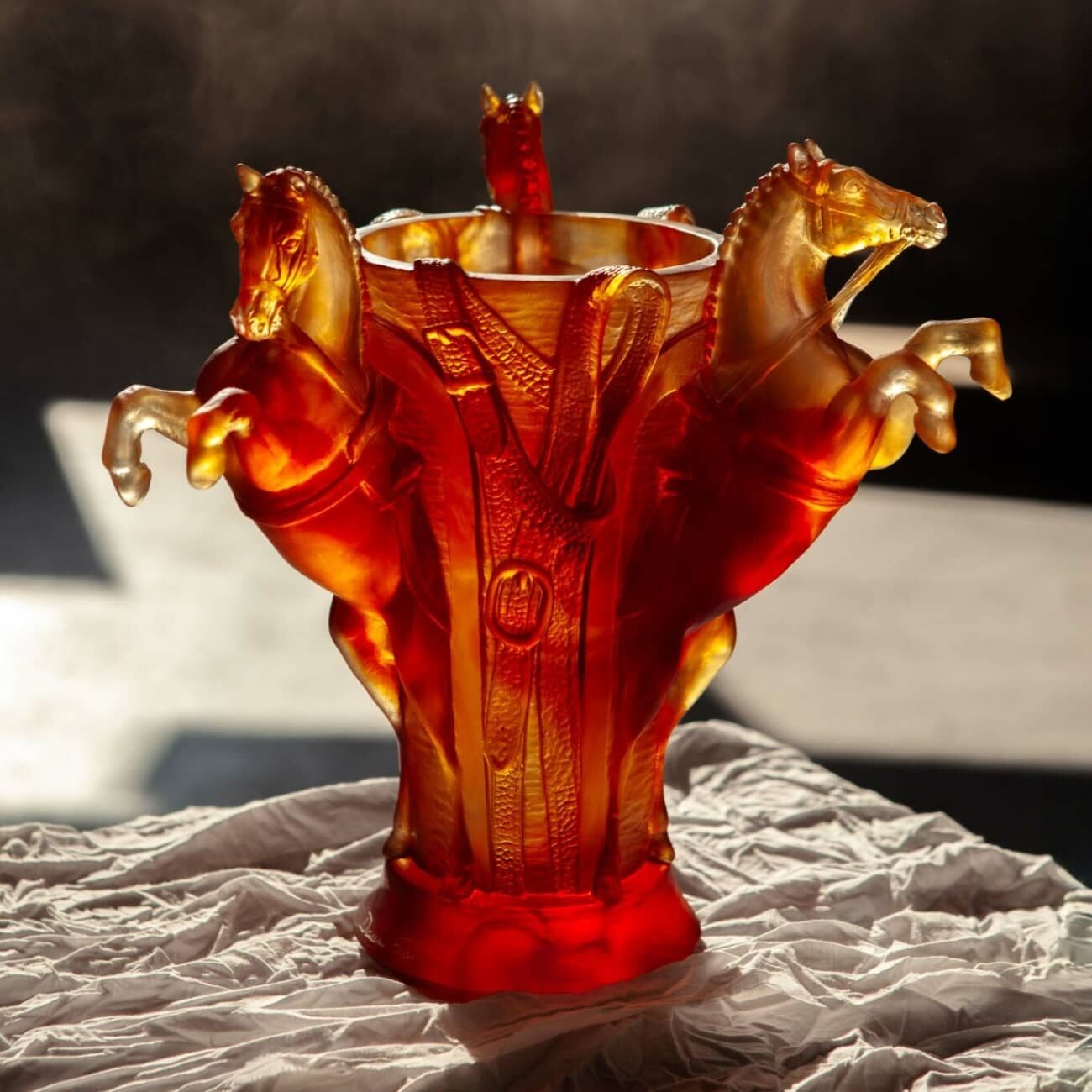 Rêve Équestre s’inspire des traditions équestres, de l’École de Vienne aux Écuries Royales de Versailles, pour créer des pièces sculpturales mettant en valeur la puissance et la grâce du cheval. Chaque vase, de différentes tailles, combine lignes architecturales et détails raffinés, évoquant l’harnachement et les motifs équestres, sublimés par des teintes ambre rappelant le cuir patiné.