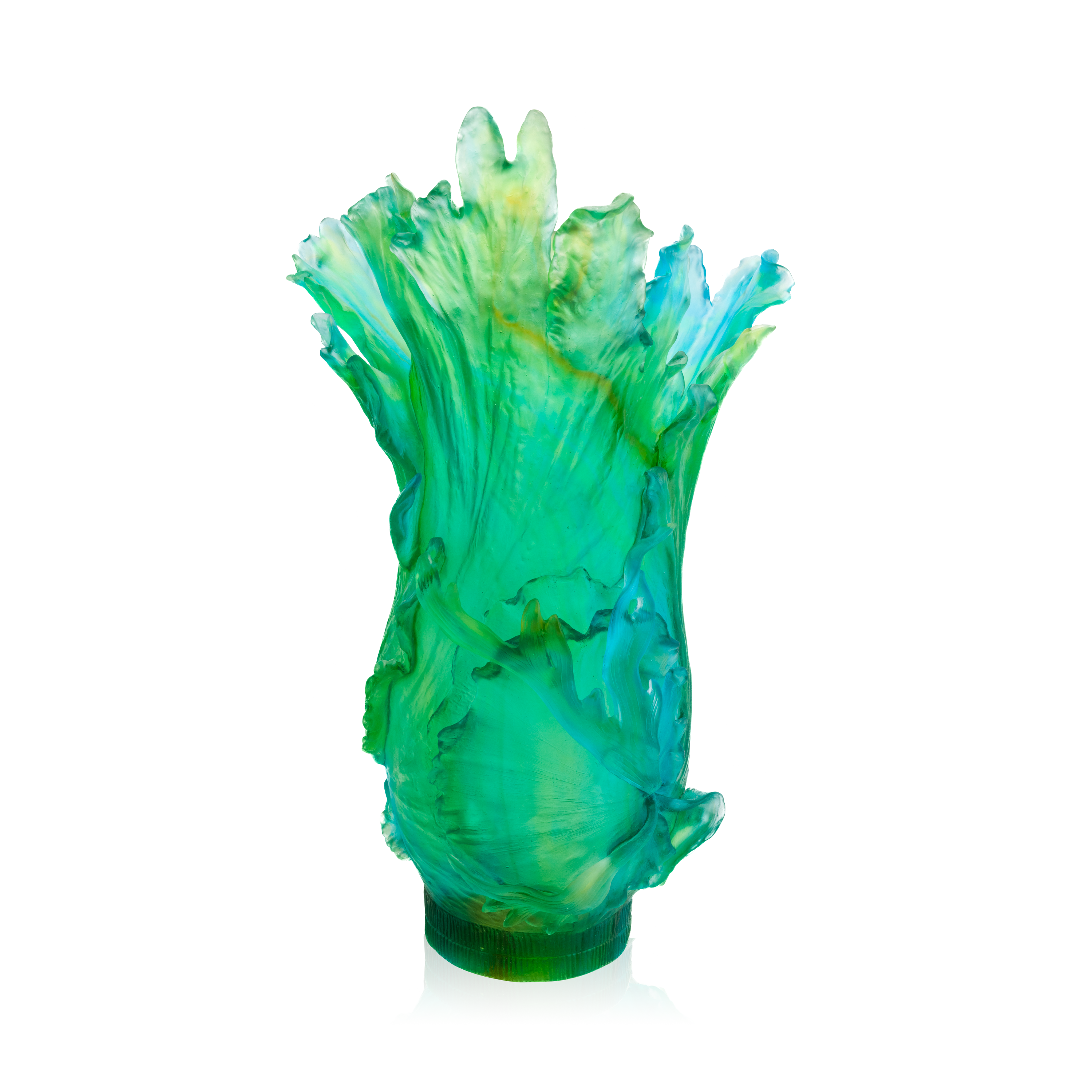 La collection Bornéo tropical se pare de vives couleurs tropicales et de spectaculaires finitions : Le vase prestige est rehaussé d’un sublime socle en bronze patiné orné de feuilles tropicales et de léopards tachetés. Le décor est finement sculpté, les reliefs marqués soulignent les détails et le ton vert turquoise de la patine se marie harmonieusement avec les couleurs du cristal. Les nouvelles couleurs déclinées sur le vase prestige et sur le vase magnum, dans des tonalités très lumineuses de bleu, de vert et de subtiles nuances ambrées offrent une nouvelle dimension à ces pièces spectaculaires.
