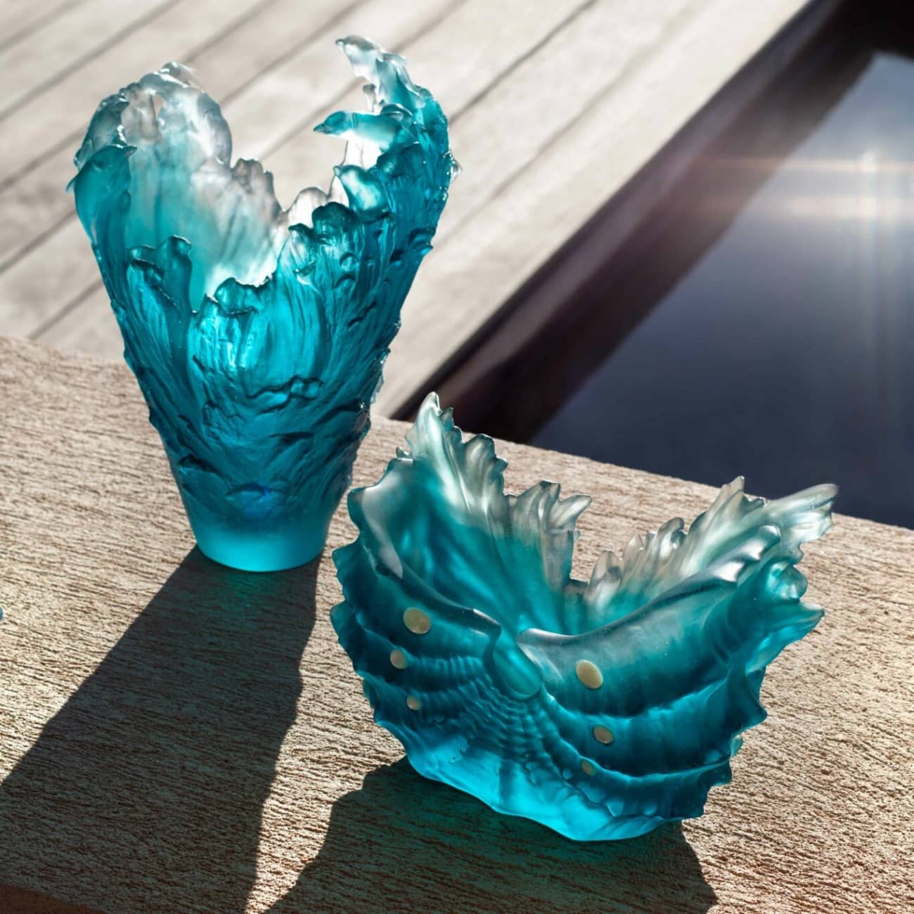 Cette collection est une célébration de la vie marine, où chaque pièce, réalisée en pâte de cristal, une technique distinctive de Daum, dévoile des nuances de bleu rappelant les eaux limpides et cristallines. Les créateurs de Daum ont su capturer l’essence de cette vie aquatique en mouvement, créant ainsi des œuvres d’art qui semblent presque vivantes.