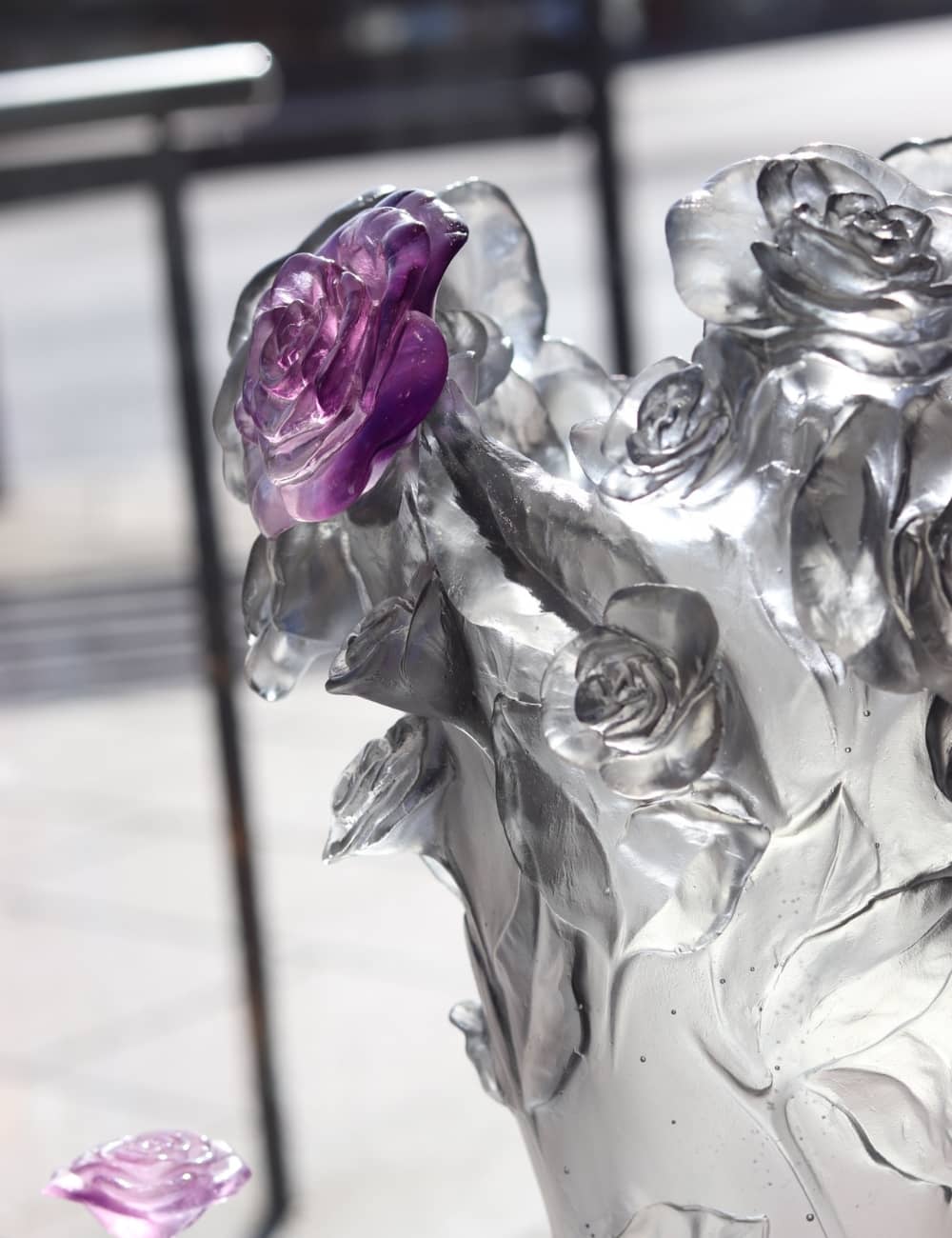 VASE ROSE GRIS FLEUR VIOLETTE DAUM, Cultivée depuis des temps immémoriaux, la rose est certainement la fleur que l’on offre le plus. L’intensité et la puissance des tons pastels utilisés par Daum permettent à cette nouvelle collection d’offrir toute en subtilité la générosité de cette fleur symbole d’amour.