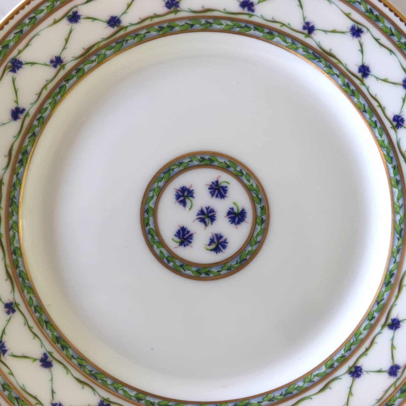 Chaque pièce est rehaussée de filets d’or finement appliqués à la main, qui viennent sertir le décor avec une noblesse discrète. Le centre, ponctué d’un médaillon à semi de barbeaux, apporte équilibre et délicatesse à l’ensemble, selon un schéma décoratif cher aux arts de la table royaux.