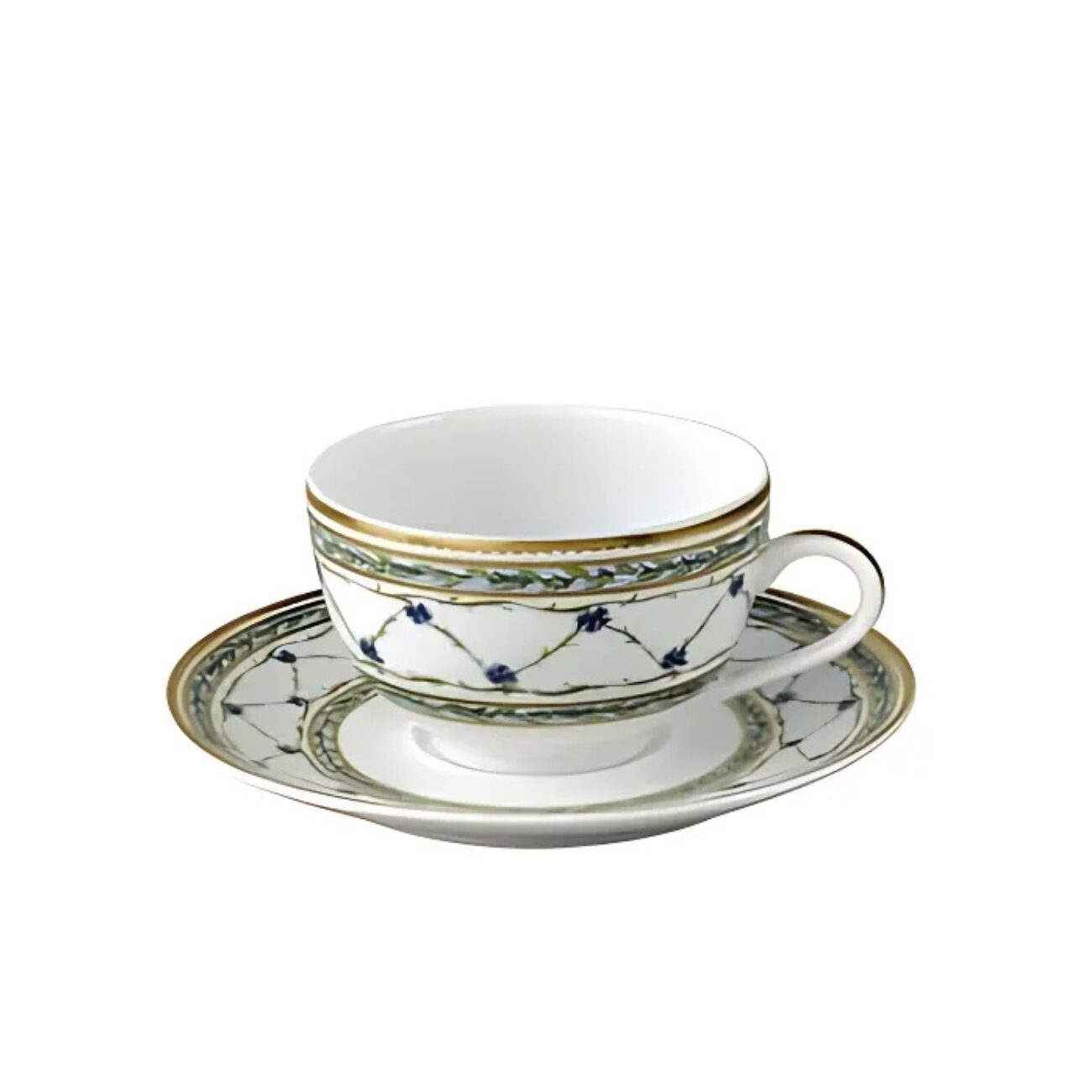 Chaque pièce est rehaussée de filets d’or finement appliqués à la main, qui viennent sertir le décor avec une noblesse discrète. Le centre, ponctué d’un médaillon à semi de barbeaux, apporte équilibre et délicatesse à l’ensemble, selon un schéma décoratif cher aux arts de la table royaux.