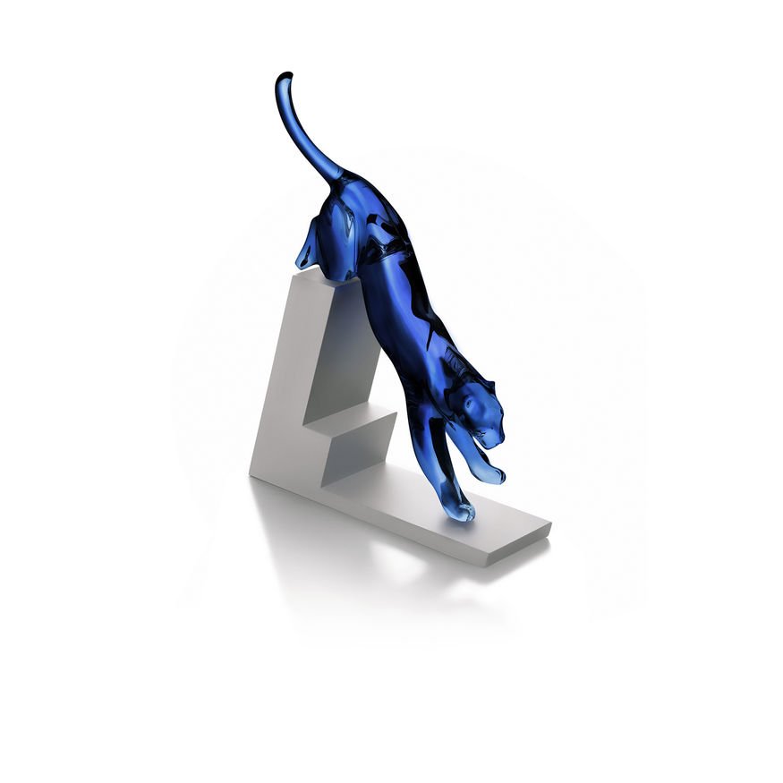 BLUE CRYSTAL PANTHER THE LEAP BACCARAT, Designed for Baccarat by Rosetta, the panther’s nimble, feline movement is embodied in all its splendor. The slanted silhouette imbues the panther with a lean, hypnotic grace. The prowling figurine and graphic black resin base are not glued together; rather, the two modules are independent and the panther simply rests on it. The acrobatic posture is steadied using the marks indicated discreetly at the base, maintains the figurine’s equilibrium. The juxtaposition of the black base against the Baccarat crystal underscores its radiance all the more. Moreover, the detailing looks even sharper against the opacity of the black shape.