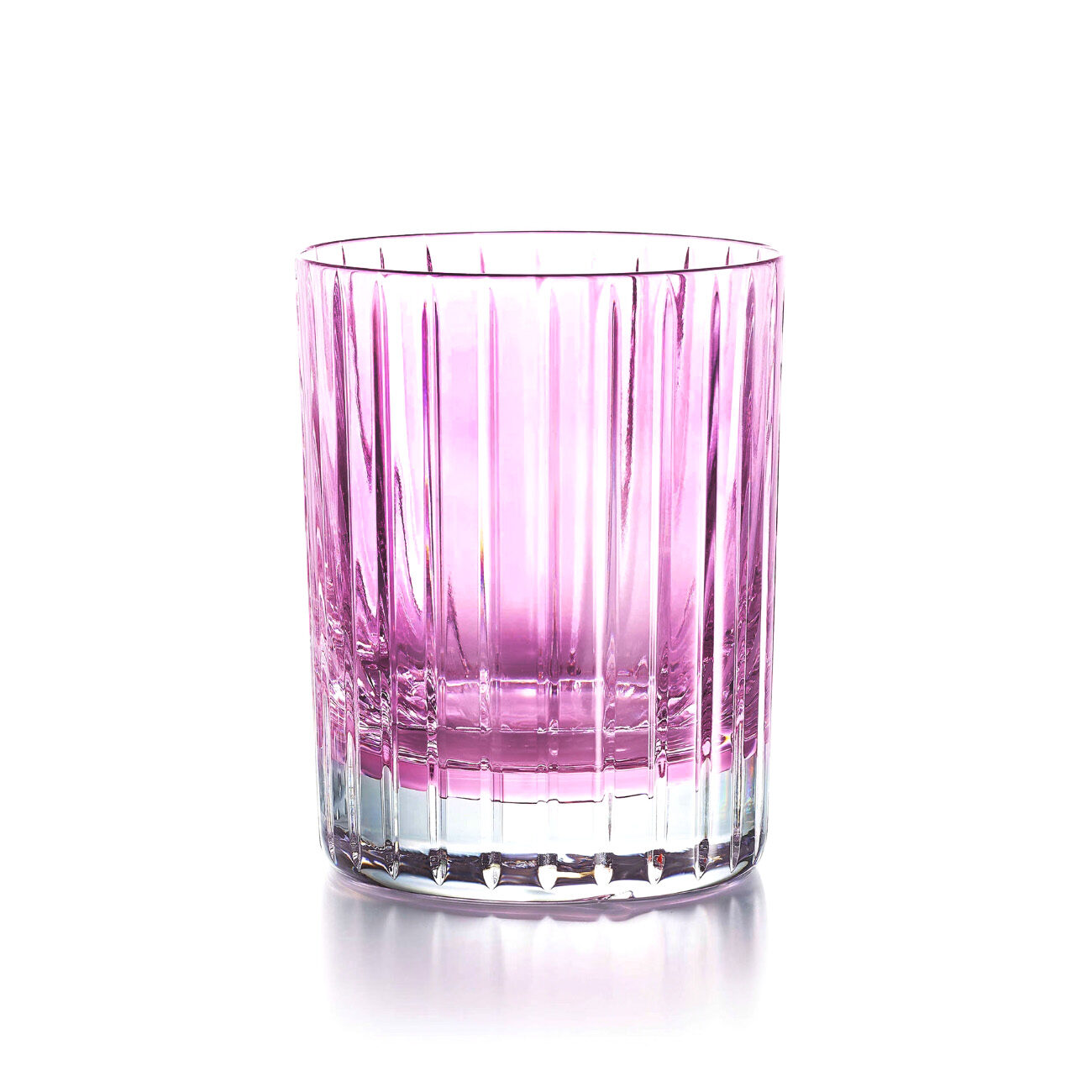 Discover Harmonie tumbler pink Baccarat. Consecutive parallel cuts travel cleanly along the Clear crystal grazing the tumbler from its lip all the way down to its thick base. These lines emphasize the verticality of the tumbler as you sip your quality spirits and mixed drinks. The vertical sweep of the striping is also present on other pieces of the Harmonie collection, which includes highball glasses and a round whiskey decanter.