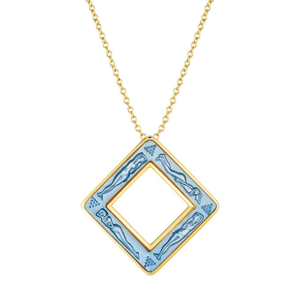 In 1927, René Lalique’s boundless imagination and creative genius lead to the creation of the Bacchantes vase. This work of unparallel beauty, is captured in this revelation crystal in which each detail is magnified, revealed, highlighted. As unparallel beauty, the splendor and sensuality of this 4 young priestesses of Bacchus offer with their voluptuous beauty and curves on this delicate diamond-shaped crystal in timeless clear or ice blue crystal, mounted as a pendant.