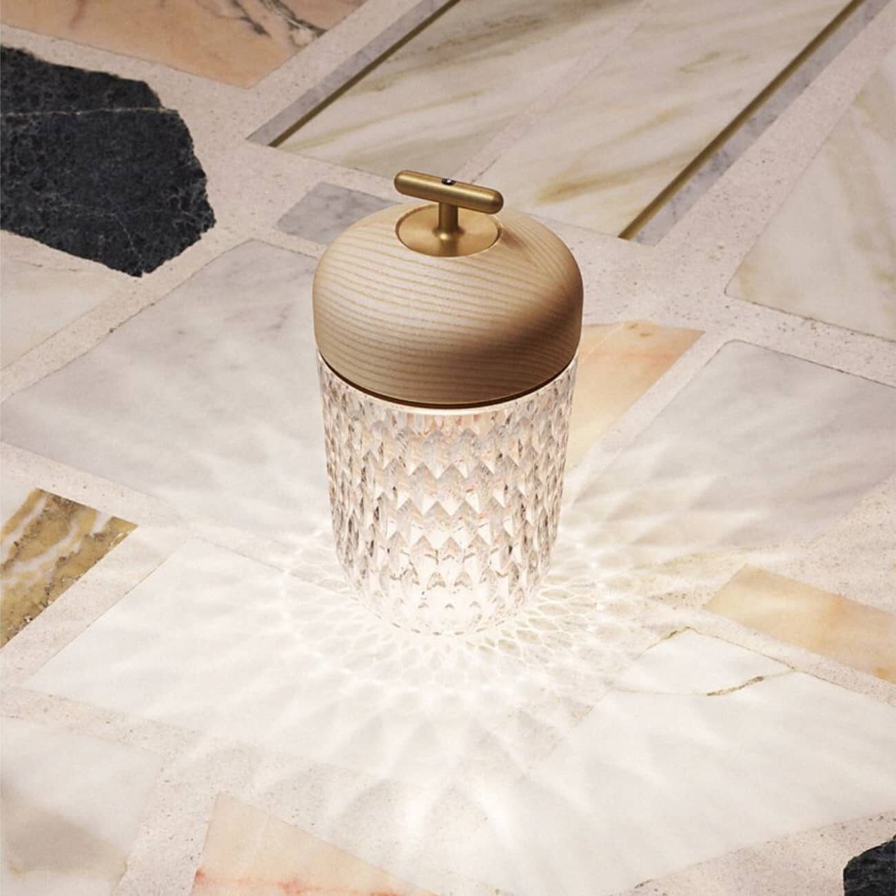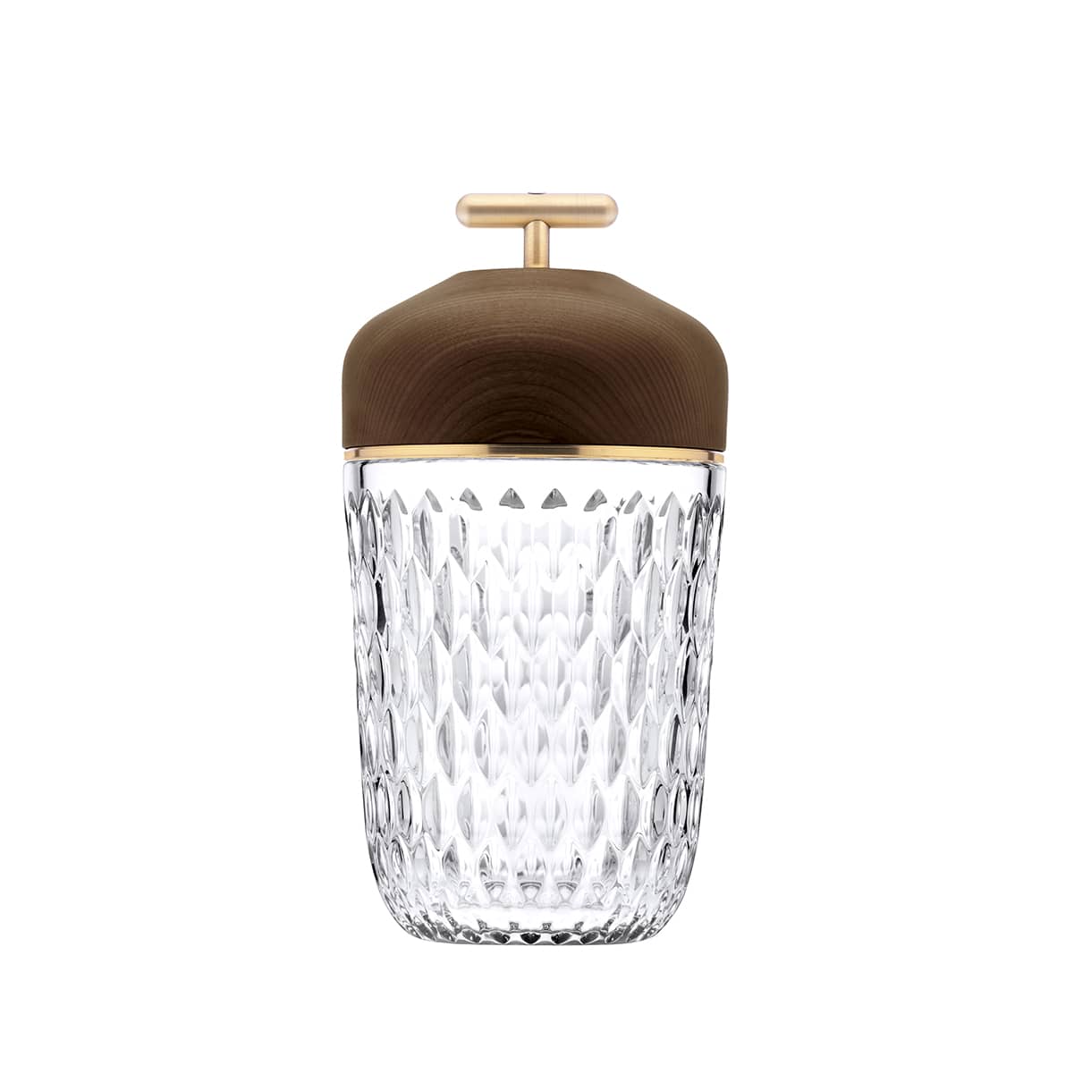 Inspired by the forest surrounding the Saint-Louis manufacture, the Folia collection juxtaposes two prestigious materials: crystal and wood. Each piece in the collection is decorated with geometric and organic cuts, in homage to the leaves in the Moselle woodland. As a table or a desk lamp, on a terrace or a boat, the contemporary design of the Folia portable lamp complements all decorative styles.