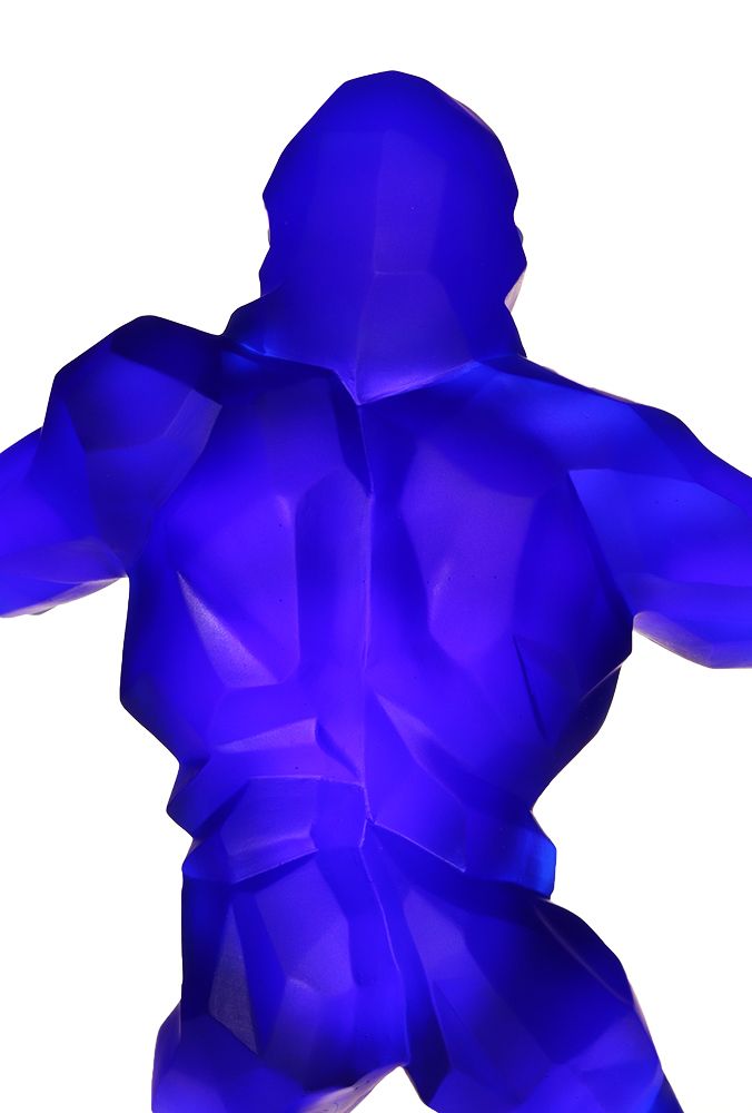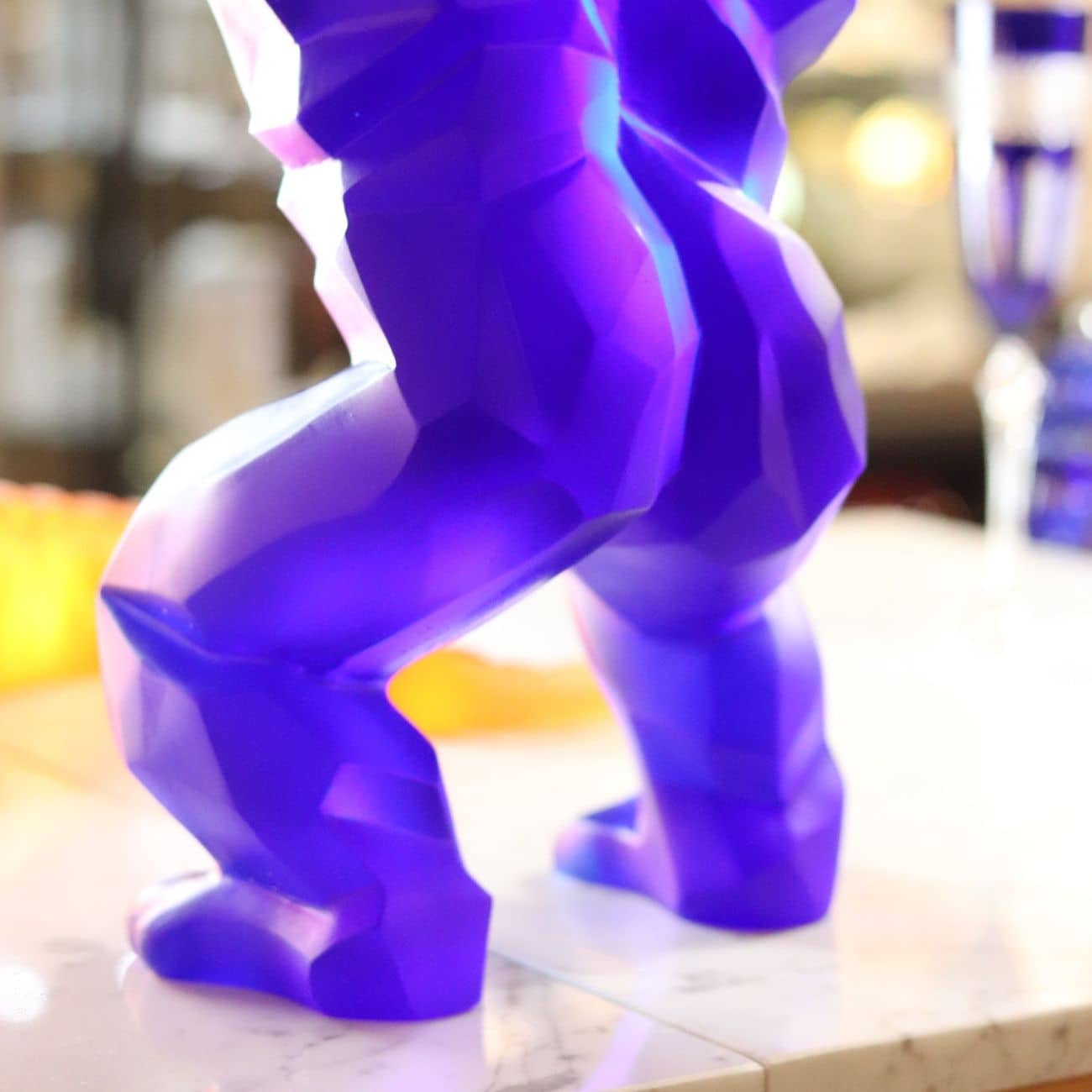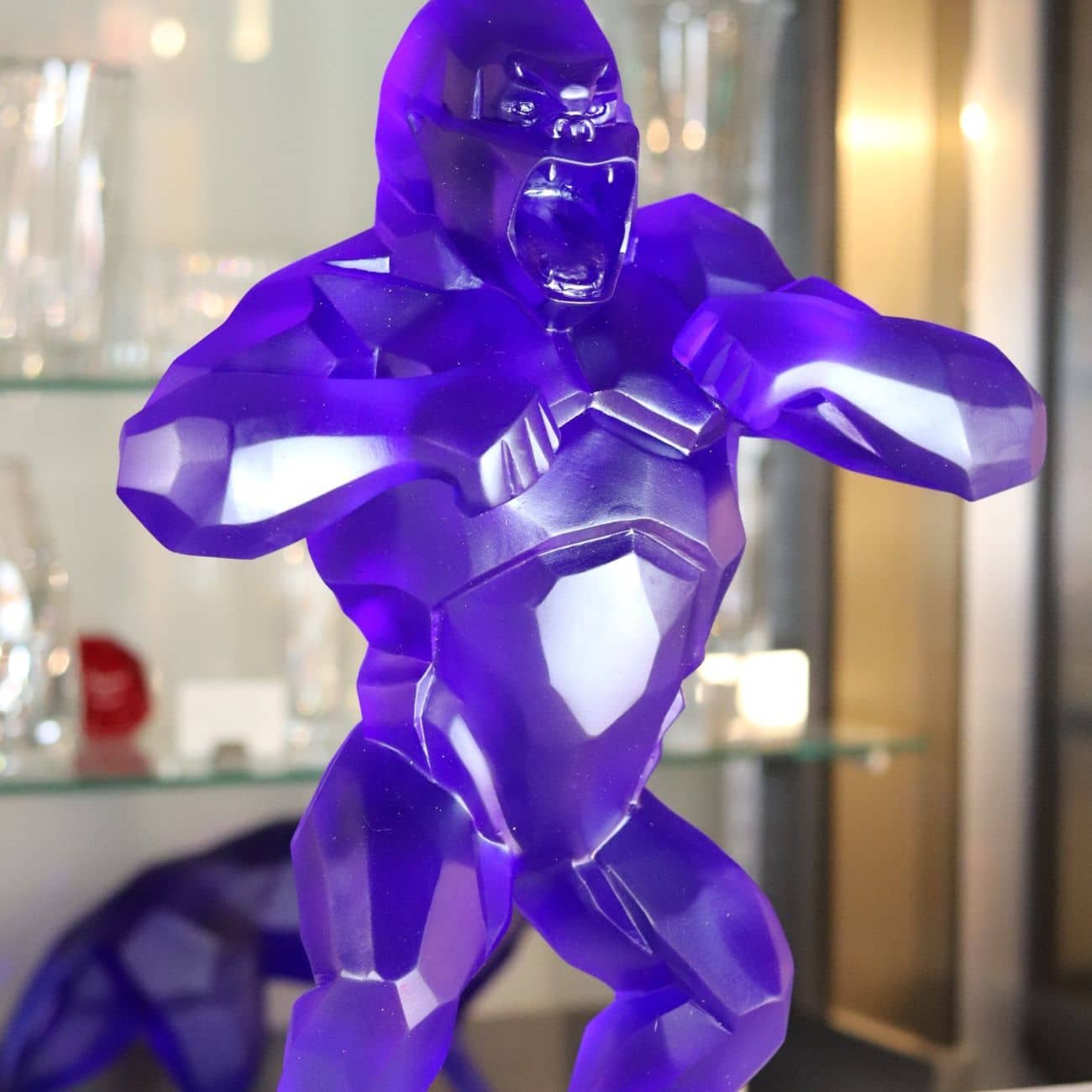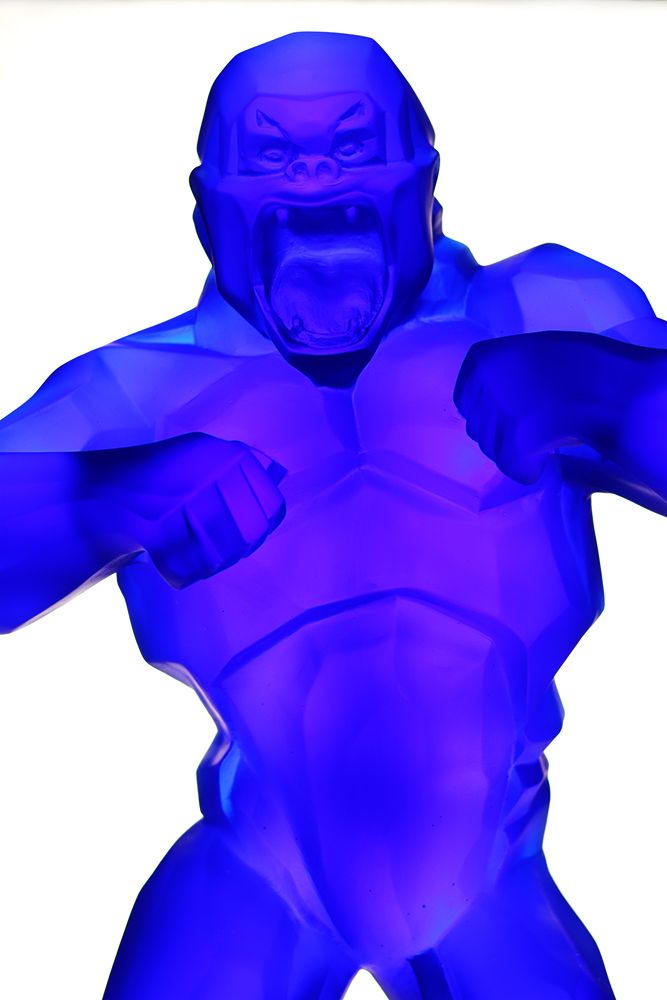 BLUE WILD KONG BLUE ORLINSKI DAUM, Cut in facets, as is a diamond, and with its frightening fangs, Wild Kong portrays itself as invincible as it beats its chest with its threatening fists, all aspects of the “Born Wild” concept. Discover Richard Orlinski sculptures.
